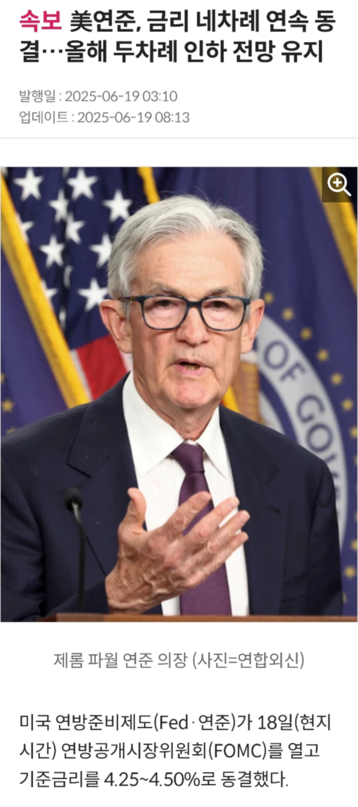 올해 들어 네 번째 동결이다. 연준은 FOMC 결정문에서 “실업률은 낮은 수준을 유지하고 있으며, 노동시장 여건도 여전히 탄탄하다”면서도 “인플레이션은 다소 높은 수준을 유지하고 있다”고 언급했다. 이어 “경제 전망에 대한 불확실성이 줄어들었지만 여전히 높은 수준”이라며 “최대 고용과 2% 인플레이션 달성 목표의 양 측에 대한 위험을 주의 깊게 모니터링하고 있다”고 설명했다. 이에 따라 한국(2.5%)과의 기준금리 차이는 상단 기준 2.00%포인트로 유지됐다. 연준이 함께 공개한 경제전망요약(SEP)과 점도표(dot plot)에 따르면, 연내 금리 인하 횟수에 대한 위원들의 전망은 기존 '2회'를 유지했다. 연준 위원들은 올해 최종 기준금리 수준(중앙값)을 3.9%로 제시했다. 지난 3월 예측(3.9%)을 유지한 것 이다. 이에 따라 연준은 현재 기준금리 4.25~4.5%에서 올해 약 두차례 인하가 가능할 것으로 보고 있다. .. 후략 ..