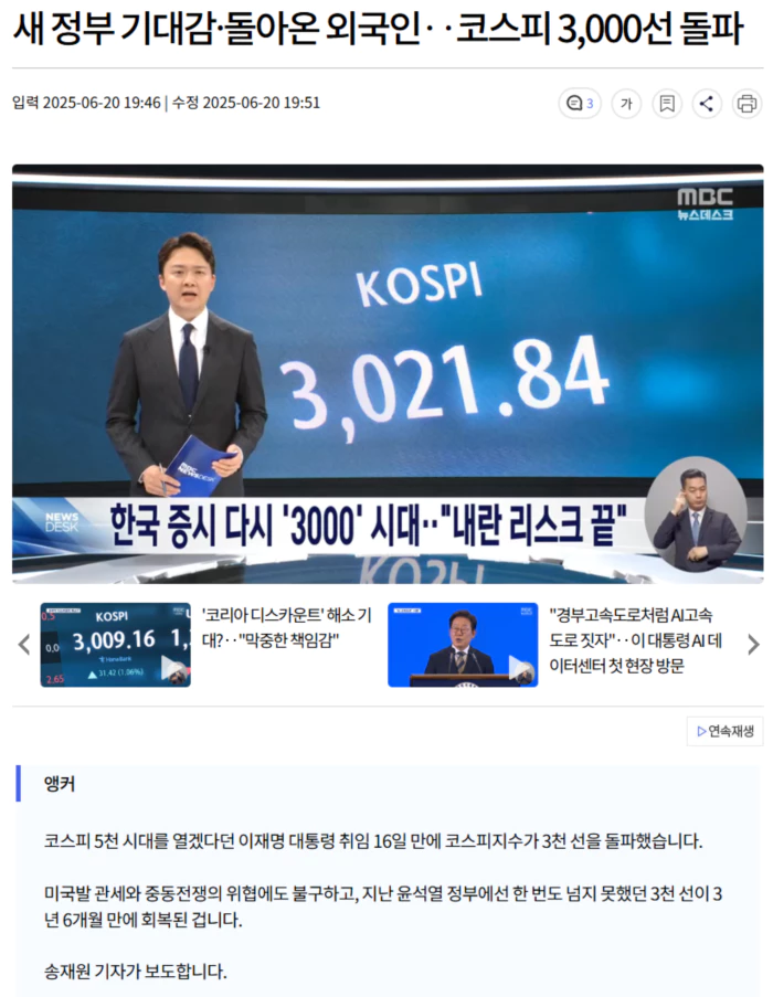 3,000선을 돌파한 채 장을 마감한 건 지난 2021년 이후 약 3년 6개월 만입니다.