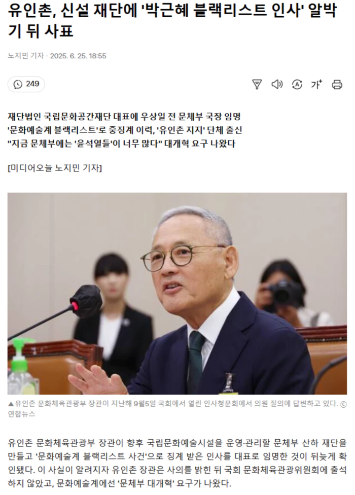 유인촌 장관이 신설된 '재단법인 국립문화공간재단' 대표로 우상일 전 문체부 예술국장을 임명한 사실이 지난 23일 국민일보 보도로 알려졌다. 문체부 비영리법인현황을 보면 국립문화공간재단은 지난해 12월9일 법인설립허가를 받았으며, 설립 목적으로 '당인리 문화창작발전소 등 국립문화예술시설을 운영·관리하고 문화적 공간환경을 조성·제공함으로써 문화와 예술의 사회적 가치를 확산하는 데 기여'한다고 밝히고 있다. 주소지는 서울역 인근 복합문화공간으로 조성된 문화역서울284(서울 중구 통일로1)로 돼 있다. 국립문화공간재단은 문체부가 지난 2023년 12월28일 밝힌 '문화예술 3대 혁신전략 10대 핵심과제' 가운데 '국립문화예술시설 관리기관 설립' 일환으로 만들어졌다. 당시 문체부가 설립하겠다던 '가칭 문화예술복합관리센터'가 지금의 국립문화공간재단으로 만들어졌다는 것이다. 현재 국립문화공간재단 홈페이지는 외형만 갖췄을 뿐 재단 소개, 공지사항 등 아무런 정보도 게재돼 있지 않다. 특히 이 재단 대표로 우상일 전 문체부 예술국장을 임명했다는 점에서 비판이 높다. 우상일 전 국장은 지난 2017년 조윤선 당시 문체부 장관에게 한강 작가, 봉준호·박찬욱 감독 등이 포함된 '문화예술계 블랙리스트'를 보고한 것으로 드러나 정직 1개월 처분을 받은 것으로 알려졌다. 2014년엔 문체부 체육국장 신분으로 출석한 국회 교육문화체육관광위원회 전체회의에서 김종 당시 문체부 2차관에게 '여야 싸움으로 몰고 가야'라는 쪽지를 건네 논란을 불렀다. 우 전 국장은 특히 지난 2023년 출범한 보수 성향 단체 '문화자유행동' 사무총장을 맡았다. 이 단체는 윤석열 전 대통령이 대통령실 문화체육특별보좌관이었던 유인촌 문체부 장관 후보자를 지명해 문화예술계 반발이 일자, 유 후보자를 지지한다고 밝혔던 단체다. 유 장관의 이번 인사 문제가 알려지자 문화예술계에선 '문화체육관광부 관료주의 대개혁'을 요구하고 나섰다. 문화연대를 비롯한 20여 개 단체들은 25일 공동 성명을 내고 “온전히 국민의 직접민주주의로 윤석열 내란 세력들을 몰아내고 새 정부가 들어섰지만, 문체부 관료 카르텔의 악행은 거의 막장 수준으로 치닫고 있다”며 “'현직 주요 문체부 관료들이 노후 대책으로 직접 예술의전당 사장 자리 등을 적극적으로 로비하며 준비하고 있다'는 제보가 있을 정도로 사태가 심각하다”고 지적했다. .. 후략 ..