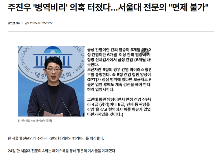이날 A씨는 "급성 간염이란 간의 염증이 6개월 이내에 소멸되는 경우를 말한다. 만성 간염이란 6개월 이상 간의 염증이 지속되는 경우를 말한다"며 "징병 신체검사에서 급성 간염 (6개월 내에 끝나는)을 갖고 5급을 주진 못한다"고 알렸다. 이어 "보균자란 B형의 경우 간염 바이러스 항원 검사상 양성으로 나오는 경우를 통칭한다. 즉 B형 간염 항원 양성이지만 간기능검사(GOT, GPT)가 정상 범위에 있다면 보균자로 판정한다"며 "이는 무조건 현역"이라고 했다. 그러면서 "물론 입영 후에도 계속 검진을 해야 한다. B·C형 '보균자'는 3급으로 현역 입영시킨다"며 "그런데 항원 양성이면서 만성 간염 진단을 받았다면 그 심한 정도에 따라 4급 (공익)이나 5급, 면제 등 판정을 내린다. 어느 시기에도 '급성 간염'을 갖고 현역에서 빼줄 이유가 없었다는 것"이라고 설명했다. 그는 "신검 시에 급성 간염으로 간기능검사 수치가 매우 높았었다면? 그땐 재검 대상(7급)이 된다. 급성은 보통 치료하면 회복되며 회복되었다면 1급이다. 치료 후에도 호전되지 않았다면? 다시 재검한다"며 "이후 회복되었다면 결국 현역이다. 재검했는데 악화되었다면? 그땐 상태 봐서 판정한다. 우리나라엔 간염 보균자가 워낙 많기 때문에 간염 갖고 군대 빼기가 굉장히 어렵다"고도 했다. .. 후략 ..