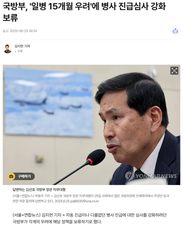 국방부는 25일 "병 진급 제도 관련 국민 청원과 국회의 요구를 고려해 해당 제도의 시행을 잠정 보류하고 시행 방안에 대해 전면 재검토"하기로 했다고 밝혔다.