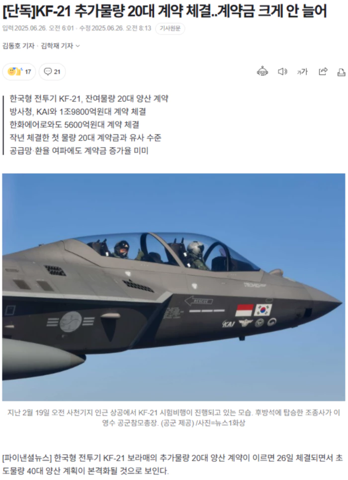 공급망 문제와 환율 상승 여파로 계약 규모가 크게 늘어날 것으로 전망됐으나 계약 규모는 예상과 달리 지난해와 유사한 것으로 알려졌다. 지난해 6월말 한국항공우주산업(KAI)과 첫 물량 20대 양산 계약을 체결하는 방위사업청은 1년만에 추가 20대 양산 계약을 체결하면서 계획대로 진행은 하게 됐다. 같은시기 한화에어로스페이스와도 KF-21에 장착될 엔진 공급 계약을 체결했던 방사청은 최근 한화에어로스페이스와 추가 엔진 공급 계약을 체결했다. 26일 정부와 방산업계에 따르면 방사청은 한화에어로스페이스와 5600억원대 KF-21 엔진공급 계약을 최근 체결했고, KAI와는 이번 주 내로 1조9800억원대 항공기 양산 계약을 체결한다. KAI의 이같은 계약규모는 4000억원대 개발비 투자환급금은 제외된 수치다. KF-21 추가 물량 20대에 대한 계약으로, 한화에어로스페이스와 KAI 모두 지난해 6월 체결했던 20대 양산 계약 규모에서 크게 벗어나지 않는 수준에서 추가물량 계약을 체결한다. 지난해 6월 KAI와 한화에어로스페이스는 각각 1조9610억원, 5560억원에 KF-21 20대 물량 양산 계약을 체결한 바 있다. 환율 상승을 비롯해 공급망 이슈로 계약 규모가 10% 이상 늘어날 것이란 전망도 제기됐지만, KAI의 경우 1%대 증가율에 그칠 것으로 파악되는 등 생산비 증가율 부담을 최소화시킨 것으로 전해졌다. KF-21의 초도 양산 물량은 당초 40대였으나, 공대공 미사일 무장 성능 검증 등 기술적 완성도가 낮다는 한국국방연구원(KIDA)의 사업타당성 조사 결과로 인해 첫 20대 물량은 지난해, 나머지 20대 물량은 올해 추가 계약하기로 했다. 일각에선 예산상 문제로 나머지 20대 물량 양산 계약마저 미뤄질 수 있다는 우려도 제기했지만 결국은 예정대로 진행되는 분위기다. KF-21의 최초 양산물량을 절반 수준으로 줄이려는 KIDA의 지적에 당시 더불어민주당 대표였던 이재명 대통령은 반대의견을 내면서 "안보에는 여야가 따로 없기에 민주당은 국민 염원이 담긴 KF-21 사업이 계획대로 진행될 수 있도록 제대로 살피고 할 일을 다하겠다"고 강조, 초도물량 40대 생산 의지를 피력한 바 있다. 현재 양산이 진행 중인 KF-21은 기본 비행성능과 공대공 무장을 갖춘 블록1 기종으로, 첫 생산물량 20대는 2027년까지, 추가로 생산한 20대는 2028년까지 납품할 계획이다. .. 후략 ..