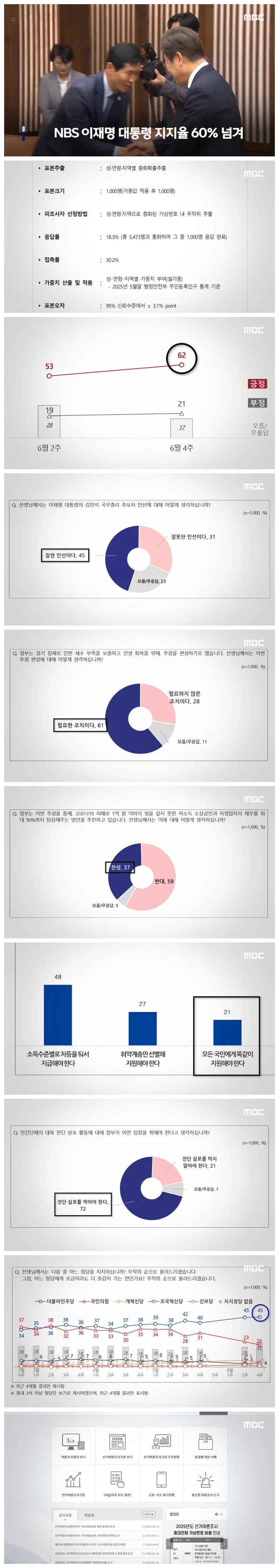 엠브레인퍼블릭·케이스탯리서치·코리아리서치· 한국리서치 등 4개 기관이 지난 23일부터 3일간 만 18세 이상 남녀 1천 명을 대상으로 진행한 전국지표조사 결과, 이재명 대통령의 국정운영에 대해 '잘하고 있다'는 긍정 평가는 62%, '잘못하고 있다'는 부정 평가는 21%로 집계됐습니다.
