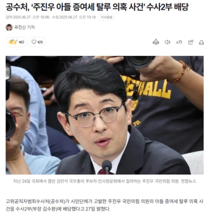 사법정의바로세우기시민행동(사세행)은 지난 23일 “주 의원이 자신의 고교생 아들에게 할아버지가 준 7억4천만원의 증여로 발생한 증여세를 납부할 목적으로 증여세 상당의 돈을 고교생 아들에게 추가로 제공했다면 별개의 증여라서 별도 증여세가 발생한다”며 “억대의 증여세를 납부해야 하는 고교생 아들에게 증여세 상당의 별도 증여를 했음에도 이에 대한 증여세는 납부하지 않은 것으로 보인다”며 주 의원을 고발했다. 증여세는 증여를 받은 사람에게 납세 의무가 생긴다. 주 의원 아들의 경우 7억4천만원을 할아버지에게 증여받았다면 2억여원의 증여세를 납부해야 했던 것으로 보인다. 이를 주 의원이 대신 내줬다면 이에 대한 증여세 납부 의무가 또다시 주 의원 아들에게 생긴다. 사세행은 이런 ‘증여세의 증여세’를 주 의원 쪽이 납부했는지를 문제 삼고 있다. 앞서 더불어민주당 의원들은 주 의원이 대통령실 법률비서관으로 재직하던 2022년, 2005년생 아들 명의로 7억4천만원의 예금을 신고했는데 증여한 과정에 탈세가 의심된다며 “세무신고 자료를 공개하라”고 주장했다. .. 후략 ..