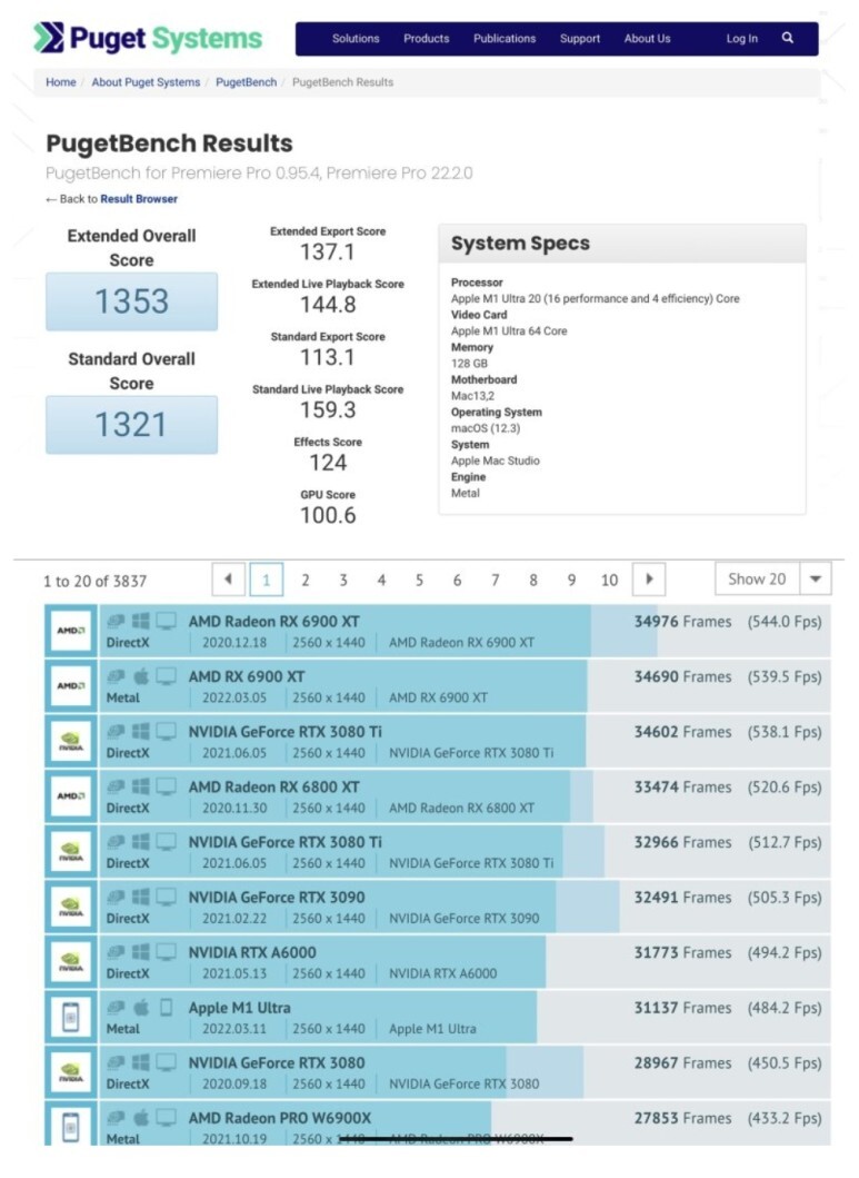Puget벤치 프리미어 프로 점수는 엔비디아 GTX 3090을 능가한다고 하며 GFX 벤치 점수는 GPU 48코어 버전으로 추정한다고 합니다.