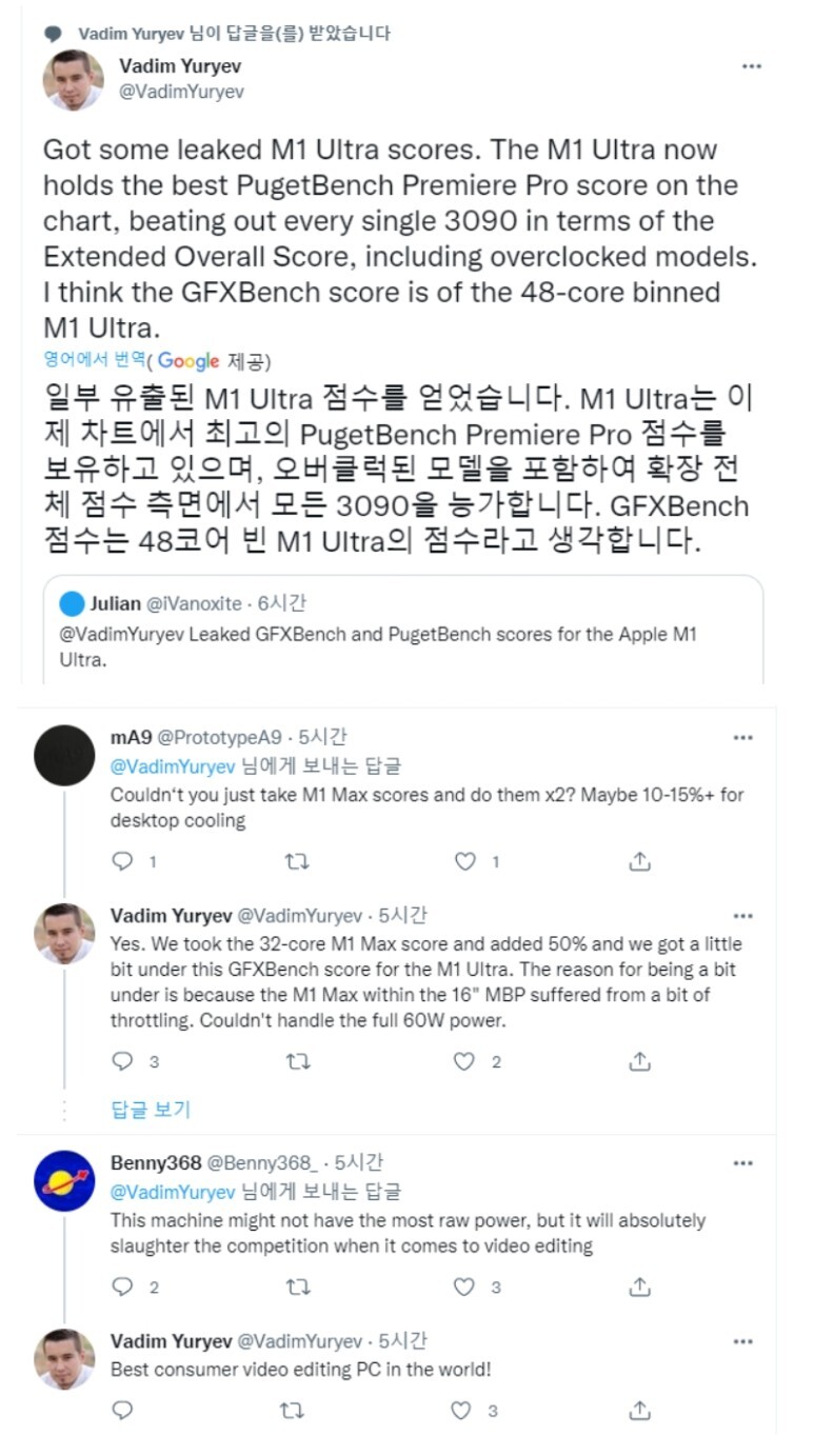 유튜브 IT 채널 Max Tech 를 운영하고 있는 IT 트위터리안 Vadim Yuryev은 트위터에 일부 유출된 M1 울트라 벤치 점수를 얻었다고 합니다.