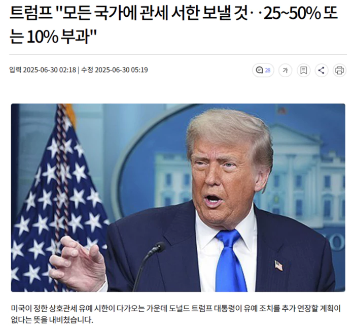 트럼프 대통령은 현지시간 29일 공개된 폭스뉴스와의 인터뷰에서 '상호관세 유예 시한이 다가오고 있는데 어떻게 할 계획인가'라고 묻자 "아주 간단하다"면서 "우리가 할 일은 모든 국가에 서한을 보내는 것"이라고 말했습니다. 트럼프 대통령은 지난 4월 2일 발표한 무역 상대국별 상호관세를 효력 발생일인 같은 달 9일 90일간 유예했고, 이후 미국은 국가별 무역협상을 진행해왔습니다. 트럼프 대통령의 이번 언급은 상호관세 유예 기간을 연장하지 않는 쪽에 무게를 싣는 것으로 해석됩니다. 트럼프 대통령은 무역협상 대상 200개국과 모두 협상할 수는 없다면서 앞으로 보낼 관세 관련 서한이 "무역 협상의 끝"이라고 강조했습니다. 트럼프 대통령은 현재 협상이 진행 중인 일본에 대해서도 "서한을 보낼 수 있다"고 했습니다. 또한, 일본이 미국산 자동차를 수입하지 않는 대신 미국은 수백만 대의 일본 차를 수입하고 있다는 점을 지적하며 "그것은 불공평하다"면서 "우리는 일본과 큰 무역적자를 갖고 있고, 그들은 이해한다"고 말했습니다. 트럼프는 특히 "우리가 할 일은 서한을 보내고 '축하한다. 미국에서 살 수 있도록 허용하지만, 25%, 35%, 50% 또는 10%의 관세를 부과할 것'이라고 말하는 것"이라고 강조했습니다. 이는 미국이 자체적으로 분석한 무역 불균형 이유에 따라 최대 50%의 상호관세를 일방적으로 부과할 수 있지만, 일부 국가에는 10%의 기본관세만 부과할 것이라는 취지로 보입니다. .. 후략 ..