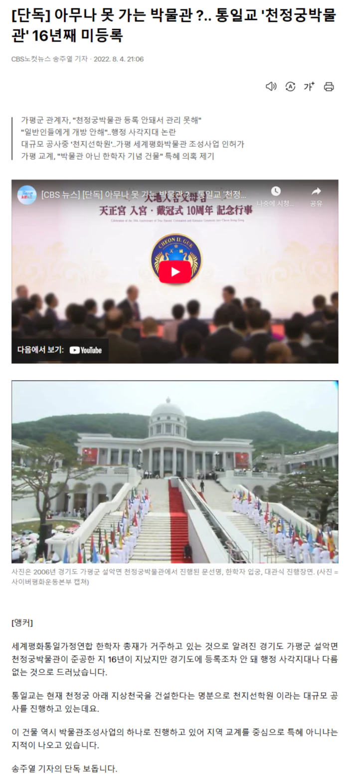 [기자] 통일교 문선명, 한학자 총재 부부는 지난 2006년 6월 경기도 가평군 설악면 산 중턱 천정궁에서 입궁식과 대관식을 거행했습니다. 천정궁 입궁, 대관식 10주년 영상입니다. 통일교 관계자는 천정궁을 신정국가 천일국의 중심이라고 소개합니다. [녹취] 통일교 관계자 / 2016년 7월 (출처 : 사이버평화운동본부 유튜브) "HJ는 참어머님 존함의 이니셜이기도 합니다. 하늘부모님께서는 본래 이상하셨던 본연의 에덴동산 하늘부모님 아래 한 가족 세계건설을 위한 출발점이자 안착점을 바로 이 HJ천원으로 보고 계시고 그 중심에 이곳 천정궁이 있습니다." 이 영상에서 보듯이 통일교는 천정궁을 문선명, 한학자를 신격화하는 핵심 거점으로 삼고, 천정궁 일대를 전 세계 통일교 신자들의 성지로 만든다는 계획을 하나씩 완성해가고 있습니다. 지난 2006년 준공된 천정궁은 외부에는 박물관으로 알려졌지만, 실상은 통일교 신자들만의 종교왕국으로 사용되고 있는 겁니다. 그런데 가평군에 확인해 본 결과 준공 된지 16년 째인 천정궁 박물관이 아직 박물관으로 등록조차 안 된 것으로 드러났습니다. 가평군 관계자는 박물관 관련 현행 법이 광역시도에 등록하는 것을 권고하고 있기 때문에 군 입장에서는 등록이 안 된 천정궁에 대해 왈가왈부 할 수 없는 상황이라고 말했습니다. [인터뷰] 가평군 관계자 "요즘에 아무리 (박물관미술관)진흥법이라고 해도 그래도요. 안 되는 걸 걸어야지 제재가 없어요. 그들이 그렇게 쓴다고 하면 그렇게 쓰는 거에요. 박물관 이란 이름을 걸고 박물관처럼 운영을 하거나 그렇다면 등록을 하고 안할 때는 영업을 못하게 하든지 그런 의무사항이 없어요 이 법에…." 일본을 비롯한 전 세계 통일교 신자들이 찾는 이곳이 겉으로는 박물관처럼 운영되지만, 실상은 박물관 용도대로 사용되는 지 알 수 없는 행정 사각지대라는 말입니다. 다른 공무원 이야기를 들어봤습니다. [인터뷰] 가평군 공무원 "만약 우리 공무원들이 간다고 하면 거기까지 가긴 가겠죠. 일반인들에게 개방해서 하는 건 모르겠네. 개방 자체를 안해요. 일반인들 한테… 통일교 손님들한테 하는지 어떤지는 모르는데…" 일반인들은 박물관임에도 접근이 안 된다는 이야깁니다. 내년 완공을 목표로 한창 공사가 진행 중인 천지선학원. 12만 5천 제곱미터 부지에서 진행되고 있는 이 공사 역시 가평 세계평화박물관 조성사업으로 건축 인·허가를 받았습니다. 경기도에서는 박물관 준공 이후 일반인이 사용할 수 있도록 반드시 승인 조건을 부여하라고 가평군에 하달했습니다. 그러나 앞서 천정궁박물관 사례에서 보듯이 겉으로는 박물관 사업이라고 하지만, 통일교 신자들의 전유물이 될 가능성이 커 보입니다. 이 때문에 지역 교계에서는 이단 통일교 종교왕국 건설에 가평군이 도움을 주고 있는 셈이라며 비판했습니다. .. 후략 ..
