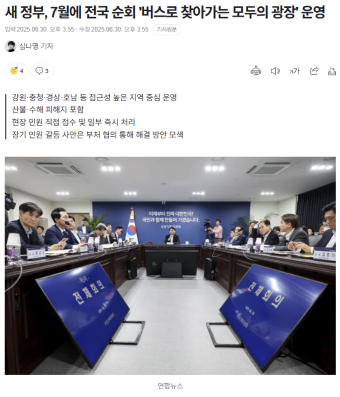 대통령 직속 국정기획위원회가 7월 한 달간 전국을 돌며 현장 민원과 정책 제안을 받는 '버스로 찾아가는 모두의 광장'을 운영한다. 이번 현장 투어는 7월 첫 주 강원권을 시작으로 충청권, 경상권, 호남권 등 4개 권역을 순차적으로 방문하며, 각 권역의 접근성 높은 도시 청사에서 상담과 접수를 진행할 예정이다. 상담은 매주 화요일부터 목요일까지 열린다. 국정기획위는 이번 프로그램을 통해 온라인 접근이 어려운 국민들의 목소리를 직접 듣고, 민생 현장의 제안을 수렴할 계획이다. 특히 산불이나 수해 등 자연재해 피해 지역을 포함해, 장기 미해결 민원과 지역 공공갈등 사례도 현장에서 확인하고 대응책을 찾겠다는 입장이다. 현장에서는 전문 조사관들이 민원을 상담하고, 즉시 해결 가능한 사안은 처리한다. 바로 조치가 어려운 사안은 관련 부처와 협의해 해법을 찾는 방식이다. 접수된 정책 제안은 실현 가능성을 검토한 후 국정과제에 반영하는 방안도 검토된다. .. 후략 ..
