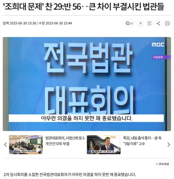 또 이와 관련해 '판결 비판을 넘어 판결을 한 법관에 대한 특검, 탄핵 등을 진행하는 것은 사법권 독립을 심각하게 침해하는 것임을 천명하고 재발방지를 촉구한다'는 안건 역시 90명 중 찬성 16명, 반대 67명으로 부결됐다고 전했습니다.
