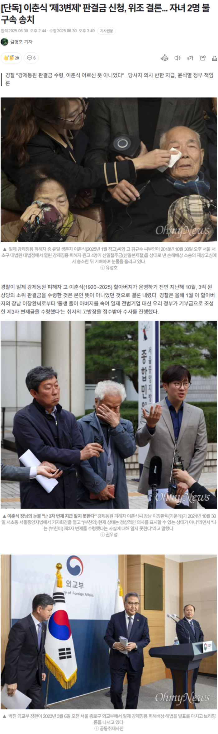 30일 <오마이뉴스> 취재를 종합하면, 이 사건을 수사해 온 광주서부경찰서는 최근 사문서 위조 및 동 행사 혐의로 이 할아버지의 자녀 A·B 씨를 검찰에 불구속 송치했다. 경찰은 이 할아버지가 판결금 수령을 위해 행정안전부 산하 일제강제동원피해자지원재단(이사장 심규선) 쪽에 제출한 신청 서류가 자녀들에 의해 위조됐다고 판단했다. 장남 이씨 주장대로 동생 A·B 씨가 실제로는 판결금 수령을 위한 서류인데, 병원 관련 서류라고 이 할아버지를 속여 서명을 적는 공간에 성(李)씨를 한문으로 적게 했던 것으로 조사됐다는 것이다. 또 이렇게 해서 작성된 서류를 정부 재단에 제출한 뒤 지난해 10월 30일 판결금을 수령한 것으로 경찰은 파악했다. 경찰은 문제의 신청서 위조가 이뤄진 곳은 지난해 10월 이 할아버지가 입원 중이던 광주 한 병원으로 판단했다. 당시 이 할아버지는 치매의 일종인 알츠하이머 진단을 받고 병원에서 투병 중이었다. 신청서가 작성된 병실에는 이 할아버지와 자녀 A·B 씨 등 3명만 있었다고 한다. 관련 서류 양식은 제3자 변제 방침을 밝힌 외교부와 지급 실무를 맡은 정부 재단 관계자가 함께 가져다준 것으로 조사됐다. <오마이뉴스>가 더불어민주당 양부남(광주 서구을) 의원실을 통해 확인한 결과, 윤석열 정부 외교부는 2023년 3월 3자 변제 방침 발표 직후 행안부와 정부 재단에 "정부 발표에 따른 후속 조처가 원활히 이행되도록 적극 협조하라"는 취지의 공문을 발송한 뒤 줄곧 한몸처럼 움직였다. 이 할아버지 자녀 A·B 씨 가운데 1명은 경찰 조사에서 혐의를 부인했으나, 또 다른 1명은 처벌을 감수하고 범행 사실을 털어놓았다고 한다. 경찰은 이 사건에 외교부 내지 정부 재단의 공모 또는 교사 가능성도 열어두고 수사를 진행했으나, 관련 혐의가 확인되지 않자 자녀 2명만 검찰에 송치하고 수사를 마무리 지었다. 다만 경찰 수사를 통해 정부 재단이 지급한 판결금이 피해자인 이 할아버지 뜻에 반해 지급됐다는 것이 드러나면서 당시 제3자 변제를 무리하게 추진한 윤석열 정부도 책임에서 자유롭지 않게 됐다. .. 후략 ..