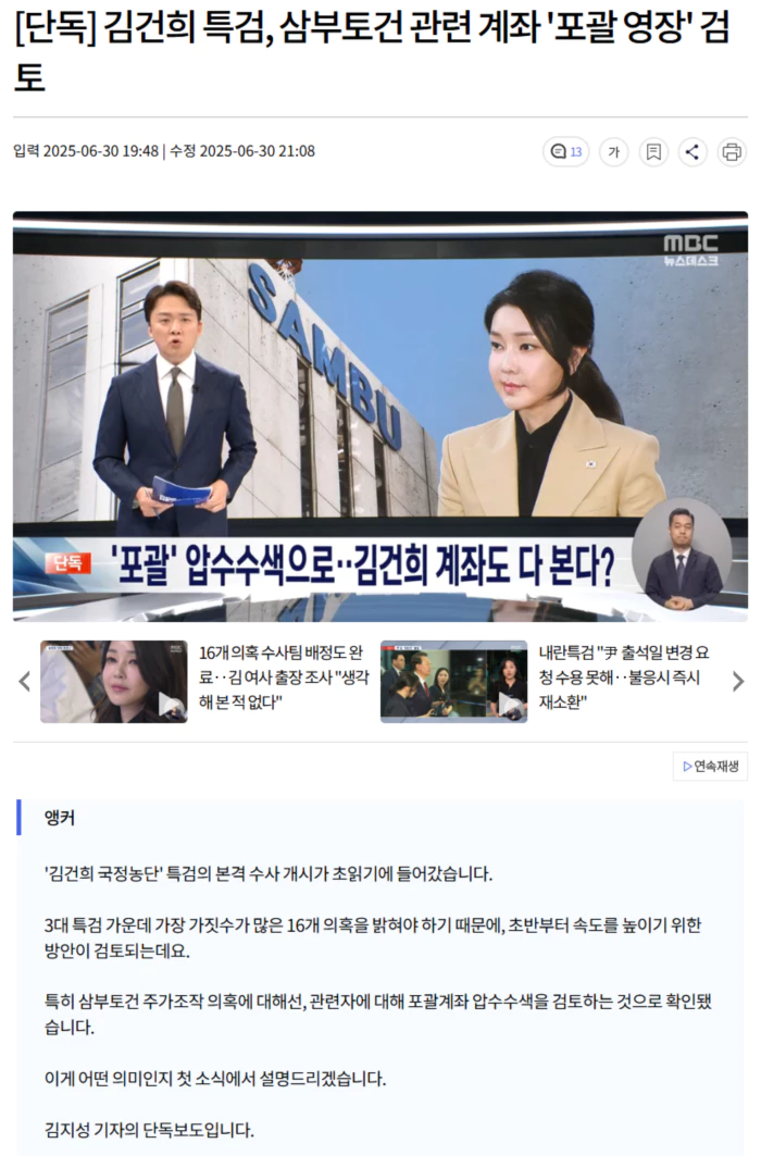 특검은 최대 150일인 수사기간에 김 여사의 관련성을 확인하기 위해서는 하나의 영장으로 여러 개의 계좌를 보는 포괄 계좌 압수수색이 시급하다고 보는 것으로 전해졌습니다.