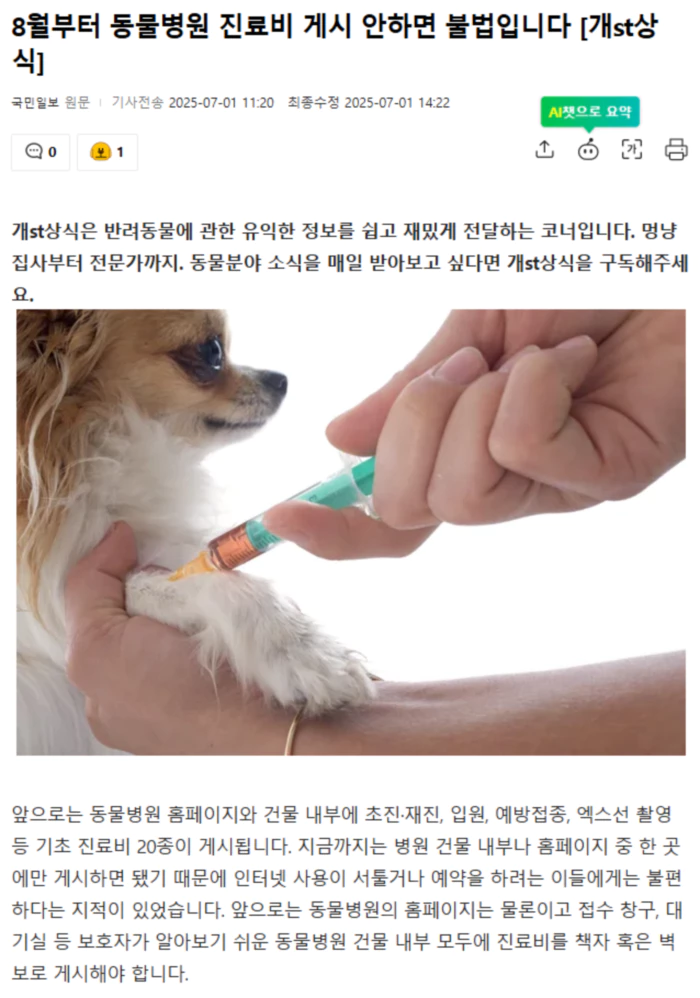 농림축산식품부는 수의사법 시행규칙을 이같이 개정했다고 30일 밝혔는데요. 오는 8월부터 동물병원 내부에 해당 동물진료비를 게시하는 것이 원칙입니다. 다만 현장 준비 기간을 감안해 오는 10월까지는 계도 기간을 두기로 했는데요. 게시한 금액 이상으로 진료비를 받는 것은 불법입니다. 진료비 게시 항목은 초진·재진, 입원을 비롯해 예방접종(종합백신, 광견병 백신 등), 구충(심장사상충·외부기생충 등), 각종 기기검사(엑스선·CT·MRI·초음파 등) 및 정밀검사(혈액화학검사·전해질검사 등) 등 총 20개 항목입니다. 반려동물들이 6개월~1년 단위로 받아야 하는 건강검진 및 예방접종 대부분의 비용이 투명하게 공개돼 반려동물 양육자들은 보다 편하게 동물병원비 지출을 예측하고 대비할 수 있게 됐습니다. 이외에도 정부는 반려동물 양육자들의 진료비 부담 완화를 위해 매년 전국 동물병원 진료비 현황을 조사해 공개하고 있습니다. 인터넷에 ‘동물병원 진료비용 현황조사(https://animalclinicfee.or.kr/index.do)’를 검색해보세요. .. 후략 ..