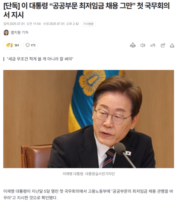 1일 행정안전부가 공개한 국무회의 회의록을 보면, 이 대통령은 지난달 5일 국무회의에서 김민석 고용노동부 차관(장관 대행)에게 올해 최저임금 논의 진행 상황을 물은 뒤 김 차관이 “경기 상황이 좋지 않고 노사 입장 차가 커서 대안을 만들기 쉽지 않다”고 보고하자 이렇게 말했다. 이 대통령은 “공공부문에서 한시적으로 인력을 채용할 때 최저임금으로 채용하는 경우가 많은 것으로 알고 있다”며 “공공부문의 본질적 목표는 세금을 무조건 적게 쓰는 것이 아니라 잘 쓰는 것이니 만큼, 최저임금으로 고용하던 관행은 바꿀 필요가 있어 보인다”고 말했다. 성남시장·경기도지사 등을 맡으며 쌓인 문제 의식을 반영한 지시로 풀이된다. 이 대통령은 또 고용노동부에 “노동시장 유연성과 사회안전망 그리고 사용자들의 부담이 서로 선순환될 수 있도록 사회적 대타협이 필요하다”며 “국민들의 신뢰를 회복하고 사회적 대타협을 크게 이룰 수 있게 연구를 해달라”고도 당부했다. 이날 공개된 회의록을 보면, 장장 3시간40분 동안 진행된 첫 국무회의에서 이 대통령은 고용노동부뿐 아니라 대부분의 국무위원들에게 깨알 질문을 하거나 촘촘한 지시를 이어갔다. 연구개발(R&D) 투자를 강조한 유상임 과학기술정보통신부 장관에게는 “우리나라 알앤디 연구 역량은 세계 최고 수준인데, 사업화가 잘 안되는 원인은 뭐냐”고 묻거나 “문제는 연구에 실패했다 하면 다음 연구 과제를 배정받는 데 불이익을 주거나 평가를 못 받는데 연구원들이 ‘성과를 보여줘야 한다’는 강박관념은 좀 풀어줘야 한다”고 말했다. 또 “현장의 얘기를 들어보면 연구의 방향이든 과제든 좀 자율성을 부여해 달라는 요구를 많이 한다”며 “연구비의 일정 부분은 증빙 없이 자율성을 부여하는 방법도 있을 것”이라고 지시하기도 했다. ‘깜짝 유임’으로 관심을 모았던 송미령 농림축산식품부 장관에겐 “사과 값이 한 개에 1만원이나 하던 때가 있었는데, 사과값이야 생산 부족에 따라서 그럴 수 있는데 사과 값이 오르니까 옆에 토마토, 바나나 가격도 오르던데 왜 그런 것이냐”고 묻거나 “케이(K) 푸드는 꽤 괜찮은 사업 영역 중의 하나인데, 외교부나 재외공관과 연계하여 협력하는 방안도 생각해 봐야 한다”고 당부했다. .. 후략 ..