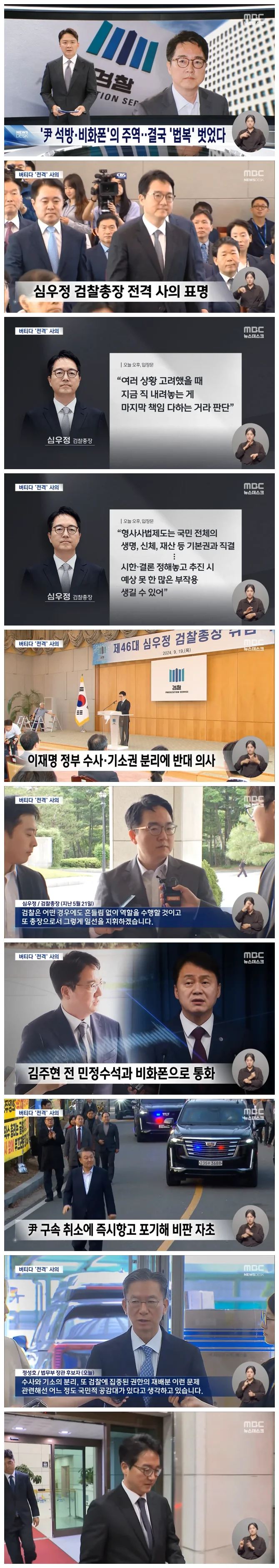 지난해 심 총장 취임 직후 검찰은 주가조작 의혹을 받던 윤석열 전 대통령 배우자를 무혐의 처분했고, 올해 3월엔 내란수괴혐의로 구속된 윤 전 대통령 구속취소 결정에 대해 즉시항고를 스스로 포기했죠.