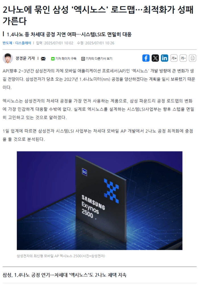 모바일 AP는 스마트폰 등 IT 기기의 두뇌 역할을 담당하는 칩으로, CPU·GPU·메모리 등 고성능 시스템반도체를 동시에 집적한다. 삼성전자는 시스템반도체를 설계하는 시스템LSI 사업부를 통해 자체 모바일 AP인 '엑시노스' 시리즈를 개발해 왔다. 모바일 AP는 최선단 파운드리 공정을 가장 빠르게 적용하는 반도체이기도 하다. 엑시노스의 경우 삼성전자 파운드리 사업부가 양산을 전담한다. 올 하반기에는 1세대 2나노(SF2) 공정 기반의 '엑시노스 2600'를 양산할 예정으로, 내년 1분기 출시 예정인 '갤럭시S26'가 핵심 적용처다. 나아가 시스템LSI 사업부는 차세대 AP 개발을 구상하고 있다. 삼성 파운드리의 공정 로드맵에 맞춰, 내년에는 2세대 2나노인 'SF2P' 공정을 활용한다. 다만 차차세대 AP 제품부터는 전략 수정이 불가피하다. 당초 삼성 파운드리는 오는 2027년께 1.4나노 공정인 'SF1.4'를 양산화할 계획이었다. 그러나 최근 최선단 파운드리 공정 개발에 난항을 겪으면서, 이를 늦추기로 했다. 업계에서는 빨라야 오는 2028~2029년에 1.4나노 공정이 양산될 것으로 보고 있다. 일례로 삼성전자는 이달 초 미국에서 진행한 'SAFE(Samsung Advanced Foundry Ecosystem) 포럼 2025'에서 고객사 및 협력사에 "차세대 공정 개발을 우선하기보다는 2나노, 4나노 등 기존 공정을 안정화하고 수율을 개선하는 데 집중할 것"이라는 뜻을 전달한 바 있다. 반도체 업계 관계자는 "통상 삼성 시스템LSI의 모바일 AP 개발 계획은 삼성 파운드리 로드맵과 연동되는 구조기 때문에, 중장기적으로 전략을 새롭게 구상해야 할 것"이라며 "삼성 파운드리가 1.4나노 대신 2나노 공정 고도화에 집중하면, 차세대 엑시노스 역시 2나노 공정을 지속 활용해야 한다"고 설명했다. .. 후략 ..