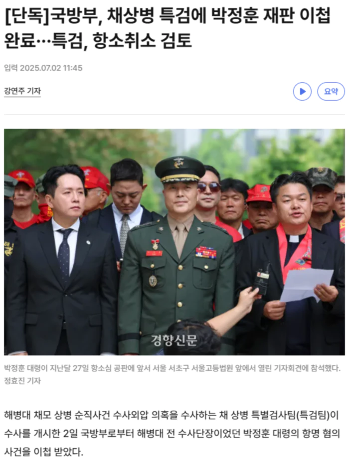 경향신문 취재결과 국방부는 이날 오전 박 대령 항명 사건의 재판기록 등 일체를 채 상병 특검팀에 넘겼다. 앞으로 특검이 박 대령 사건 항소심 공소유지를 담당한다. 공소유지 업무는 특검에 파견된 신강재 중령(육군검찰단 강원지역검찰단장)이 맡는다. 특검은 기록을 검토한 뒤 항소취소 여부 등을 결정할 방침이다. 정민영 특검보는 이날 오전 채 상병 특검팀 사무실이 위치한 서울 서초구 서초한샘빌딩에서 브리핑을 열어 “(박 대령 항소취소 여부는) 아직 결정된 바가 없어서 말하기 어렵다”고 밝혔다. 오는 11일에 열리는 재판에서는 이종섭 전 국방부 장관이 증인으로 출석할 예정이다. 앞서 군검찰은 박 대령이 채 상병 사망사건 조사자료를 경찰에 이첩하는 과정에서 상부로부터 ‘이첩 보류’ 지시를 받고도 따르지 않았다며 2023년 10월 박 대령을 항명 등 혐의로 기소했다. 당시 해병대 수사단장이었던 박 대령은 상부의 이첩 보류 지시가 외압에 의해 이뤄진 정황이 있어 부당하다고 판단해 절차대로 경찰에 조사기록을 이첩했다는 입장이다. 박 대령은 1심에서 무죄를 선고받았지만 군검찰이 항소하면서 서울고법에서 항소심 재판이 진행 중이다. .. 후략 ..