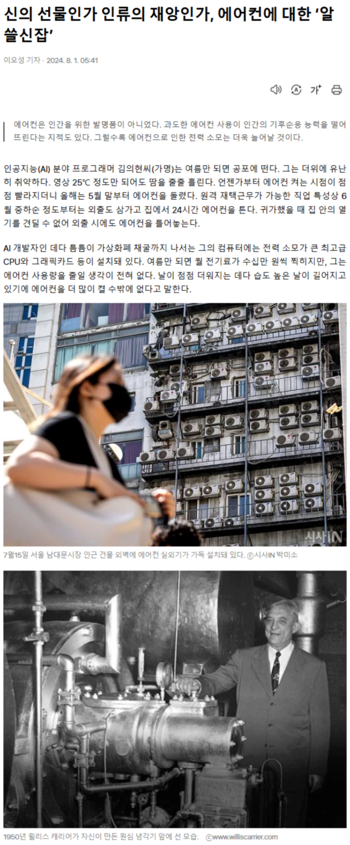 한편으로 그는 기후위기 이슈에도 관심이 많다. 그는 에어컨이 전기를 많이 소모하고, 에어컨 냉매가 온실가스를 많이 배출하는 것도 알고 있다. 죄책감이 들 때도 있지만, 그에게 더위와의 싸움은 이미 생존의 문제다. 몸과 마음이 지치는 여름철이 되면 망설임 없이 에어컨 리모컨 버튼을 누른다. 이것이 김씨만의 이야기는 아닐 것이다. 도시에 사는 사람일수록 에어컨 없는 여름을 상상조차 할 수 없다. 식당과 마트부터 엘리베이터와 공중화장실까지, 에어컨이 작동하지 않는 실내를 찾기 어렵다. 에어컨을 튼 채 문을 활짝 열고 영업하는 ‘개문 냉방’을 자제하자는 캠페인이 계속되지만 서울 명동 등 주요 번화가의 상점은 여전히 찬 바람을 밖으로 내보내며 손님을 유혹한다. 과거 에어컨은 부의 상징이었다. 한국갤럽의 연례조사에 따르면 국내 가구당 에어컨 보유율은 1993년만 해도 6%에 불과했지만, 역대급 폭염이 닥친 1994년 이후 늘기 시작했다. 1998년 24%, 2001년 36%로 증가하다가 2012년 74%, 2018년에 87%로 늘었다. 지난해 조사에 따르면 보유율이 무려 98%에 달한다. 에어컨은 이제 밥솥이나 냉장고 같은 ‘생활필수품’의 지위에 올랐다. 한국의 에어컨 보급률은 세계적으로도 매우 높다. 미국, 일본과 함께 에어컨이 많이 설치된 나라 ‘톱 3’에 꼽힌다. 2018년 국제에너지기구(IEA)에 따르면 가정용 에어컨 보급률 상위 3개국은 일본(91%), 미국(90%), 한국(86%) 순이다. 사우디아라비아(63%)나 중국(60%)보다 훨씬 높다. 유럽은 10%, 인도는 5%였다. IEA는 일평균 기온 25℃ 이상인 지역에 사는 인구는 28억명인데, 이 중 에어컨을 소유한 가구는 8%뿐이라고 밝혔다. 다만 이 자료는 6년 전 것이므로 그동안 변화가 생겼을 가능성이 높다. 특히 여름철에 크게 무덥지 않아 에어컨 보급률이 낮았던 유럽에서는 최근 10여 년 사이 폭염이 닥치면서 에어컨 보급률이 가파르게 상승하고 있다. ‘에어컨 감사의 날(Air Conditioning Appreciation Day)’이라고 있다. 매년 7월3일이다. 1902년 7월 미국의 기술자 윌리스 캐리어가 에어컨을 발명한 것을 기념하는 날이다. 어떤 이들은 더위를 물리치게 해준 에어컨을 두고 ‘신의 선물’이라고 말하지만, 에어컨은 사실 인간을 위한 발명품이 아니었다. 캐리어는 여름철 인쇄 공장에 습기가 많아 종이가 쭈글쭈글해지는 문제를 해결하는 과정에서 에어컨을 만들어냈다. 생산성 향상을 위한 도구였던 셈이다. 에어컨 도입 이후 미국 노동자의 일상은 달라졌다. 과거에는 폭염이 기승을 부리는 날이면 노동자들은 일찍 퇴근했고, 상점과 극장도 일찍 문을 닫았다. 여름철 도심은 텅텅 비곤 했다. 날씨가 노동을 통제했다. 에어컨이 등장한 이후 기술이 노동을 통제하기 시작했다. 예컨대 미국 최초로 현대식 에어컨을 설치한 곳은 땀 흘리는 블루칼라 노동자의 일터가 아니라 뉴욕 증권거래소였다. 당시에도 화이트칼라 노동은 컴퓨터 칩과 같아서 온도가 낮을수록 더 효율적으로 업무를 수행할 수 있으리라는 인식이 있었다. 1930년대부터 미국 기업가들은 “에어컨이 경제성장을 자극하고 대공황을 끝낼 강력한 힘”이라고 말했다. 에어컨을 생산하는 제조업 일자리가 늘어날 뿐 아니라 낮이 긴 여름에 남아도는 전등 전력 잉여분을 에어컨이 소모할 수 있으므로 발전업체에도 도움이 된다고 주장했다. 2차 세계대전 중인 1942년 미국 연방정부 전시생산국은 ‘개인적 쾌적함’만을 누리기 위한 에어컨 생산 및 설치를 금지하기도 했다. 도시 상점에 설치된 에어컨을 군수물자 공장으로 이전해 전쟁장비 생산 환경을 쾌적하게 하는 데 활용했다(스탠 콕스, 〈여름전쟁〉). 에어컨의 보급은 미국의 인구지도도 바꿔놓았다. 플로리다주는 캘리포니아, 텍사스에 이어 미국에서 세 번째로 인구가 많은 지역이다(2023년 기준 2261만명). 뉴욕주(4위)보다 인구가 많다. 지금은 트럼프 전 대통령의 별장(마러라고 리조트)이 있는 아름다운 휴양지로 알려져 있지만, 사실 플로리다는 사람이 살 만한 곳이 아니었다. 여름철의 극심한 무더위와 모기 때문이다. 플로리다의 인구를 증가시킨 것은 에어컨이었다. 1960년대 이후 에어컨을 구매할 여력이 있는 이들이 플로리다로 모여들었다. 일부 부유층은 겨울철에만 휴양지로 이용하기 위해 플로리다에 별장을 지었다. 그들은 별장을 사용하지 않는 여름철에도 높은 습도로 자동차와 전자제품이 상하는 것을 막기 위해 에어컨을 틀어놓곤 했다. 2006년 에어컨 이용이 과하다는 문제의식을 가진 플로리다 지역 언론이 ‘에어컨 없는 집 세 가구’를 찾아내 기사를 써서 화제가 되기도 했다. 그중 한 명은 인터뷰를 통해 “에어컨이 없다면 플로리다에서 살 수 있는 사람이 몇 명이나 되겠느냐”라고 반문했다. 같은 해 〈뉴욕타임스〉는 맨해튼에 있는 여러 매장의 온도를 일일이 측정해 고급 상점일수록 에어컨을 더 세게 튼다는 사실을 보도했다. 업계 관계자는 기사에서 이렇게 말한다. “최고급 에어컨 설비는 지위를 상징한다.” 에어컨이 무더위를 물리치고 노동환경을 쾌적하게 한다는 데 이의를 제기할 이는 없다. 여름철에 창문을 닫고 생활함으로써 모기 등 해충의 습격