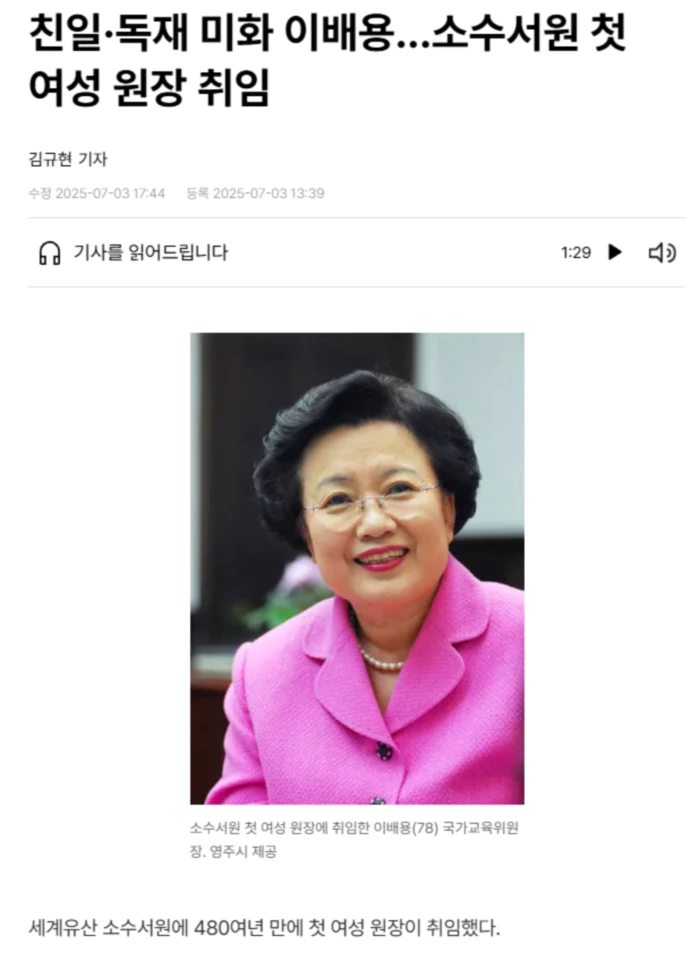 소수서원운영위원회는 3일 “우리나라 최초의 사액서원이자 유네스코 세계유산으로 등재된 소수서원에 이배용(78) 국가교육위원장이 신임 원장으로 취임했다”고 밝혔다.