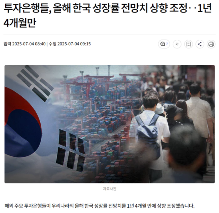 투자은행들의 2025년 한국 성장률 전망 평균치가 상향 조정된 것은 지난해 2월 이후 1년 4개월 만에 처음으로, 그동안은 하향 조정되거나 변동이 없었습니다.