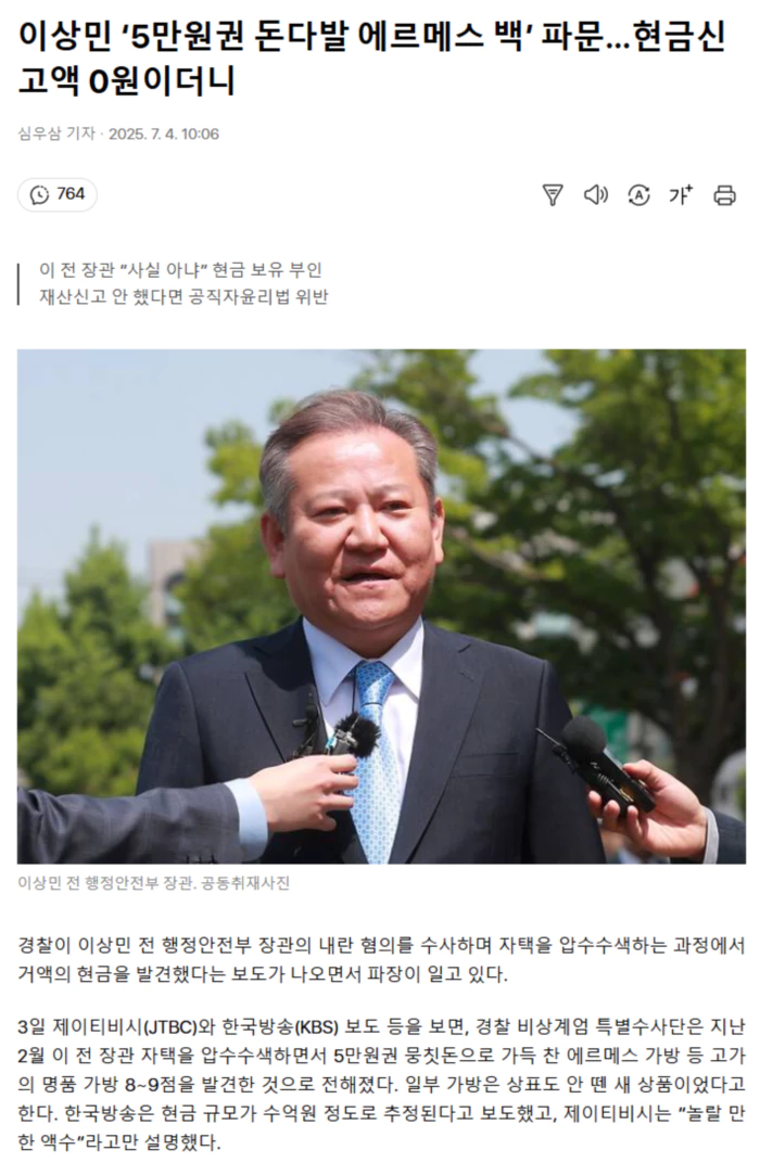 - 자택에 수억 뭉칫돈…국힘서도 “충격” 내란 특검팀은 이 전 장관 자택 압수수색에 참여한 경찰 수사관들을 참고인으로 불러 조사하는 과정에서 이런 사실을 파악했다고 제이티비시는 보도했다. 다만 경찰이 해당 가방과 현금에 대한 증거를 채취했는지는 확인되지 않았다. 이목은 현금의 출처로 쏠린다. 지난 3월21일 관보에 공고된 이 전 장관 재산 내역을 보면 현금 신고액이 없기 때문이다. 당시 이 전 장관은 본인 명의 예금 9억3200만원, 배우자 명의 예금 1억원을 신고했는데 모두 금융기관에 예치된 것이었다. 이 전 장관이 별도의 현금을 보유하고도 재산신고를 하지 않았다면, 공직자윤리법을 위반한 셈이 된다. 김종혁 전 국민의힘 최고위원은 4일 시비에스(CBS) 라디오 ‘김현정의 뉴스쇼’에 나와 “(윤석열 정부) 실세 집에서 이런 돈다발이 나왔다면 이건 정말 충격적인 얘기”라고 말했다. - 변호사 수임료 보관한 경우라면 ‘탈세’ 정치권 안팎에선 이 전 장관이 과거 변호사 활동을 하며 현금으로 받은 수임료를 자택에 보관했을 가능성이 제기됐다. 검사 출신인 양부남 더불어민주당 의원은 이날 유튜브 방송 ‘김어준의 겸손은 힘들다 뉴스공장’에 출연해 “꼭 그렇다는 건 아닌데 변호사들이 왕왕 사건을 수임하다 보면 현금으로 받는 경우가 있다”며 “그런 돈을 보관할 수도 있다”고 말했다. 만약 변호사 수임료라면 탈세 여부가 쟁점이 될 수도 있다. .. 후략 ..