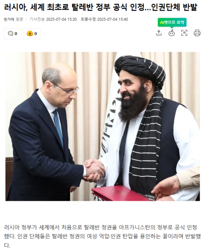 3일(현지시각) 아에프페(AFP)통신과 뉴욕타임스 등에 따르면, 아프가니스탄 외교부는 이날 엑스(X·옛 트위터) 방송에서 드미트리 지르노프 주아프가니스탄 러시아 대사가 카불에서 탈레반 외교부 장관 아미르 칸 무타키와 회동하고 “아프가니스탄 이슬람 에미레이트(탈레반 정권)를 인정한다는 러시아 정부 결정을 공식 전달했다”고 밝혔다. 러시아 외교부 역시 성명을 통해 아프가니스탄 정부에 대한 공식 인정이 무역·에너지 등 “다양한 분야에서 양국 간 생산적인 협력을 촉진할 것”이라고 했다. 2021년 탈레반이 정권을 재장악한 뒤 탈레반 정권을 정부로 인정한 건 러시아가 처음이다. 러시아 대법원은 앞서 지난 4월 탈레반의 러시아 내 활동 금지 조처도 해제한 바 있다. 러시아 외에 중국·아랍에미리트(UAE) 등이 탈레반 정권과 외교적 관계를 맺고 있지만, 이 정권을 공식 인정하지는 않았다. 지아 아흐마드 타칼 아프가니스탄 외교부 대변인은 아에프페에 “러시아는 아프가니스탄 이슬람 에미레이트를 공식적으로 승인한 첫 국가”라고 전했다. 무타키 장관 역시 “러시아의 용감한 결정은 다른 국가들에 본보기가 될 것”이라며 “러시아가 누구보다 앞섰다”고 말했다. 반면 대다수 나라는 탈레반 정부의 인권 탄압·여성 억압 등으로 이 정권을 인정하지 않고 있다. 탈레반은 1996년 처음 정권을 장악한 뒤 여성의 교육과 외출을 극단적으로 제한하는 정책으로 악명이 높았다. 1차 탈레반 정권은 2001년 미국의 아프가니스탄 침공으로 무너졌다. 그러나 탈레반은 소멸하지 않았고 미군 철수 뒤인 2021년 8월 카불에 입성해 정권을 재장악했다. 정권을 재장악한 탈레반은 남녀 분리 수업을 조건으로 여성 대학 교육도 허용한다고 밝혔다. 그러나 여학생은 초등학교를 제외한 중고등 교육을 금지하는 억압적 정책을 펼치고 있다. 여성은 공원·목욕탕·헬스장에도 출입할 수 있다. .. 후략 ..