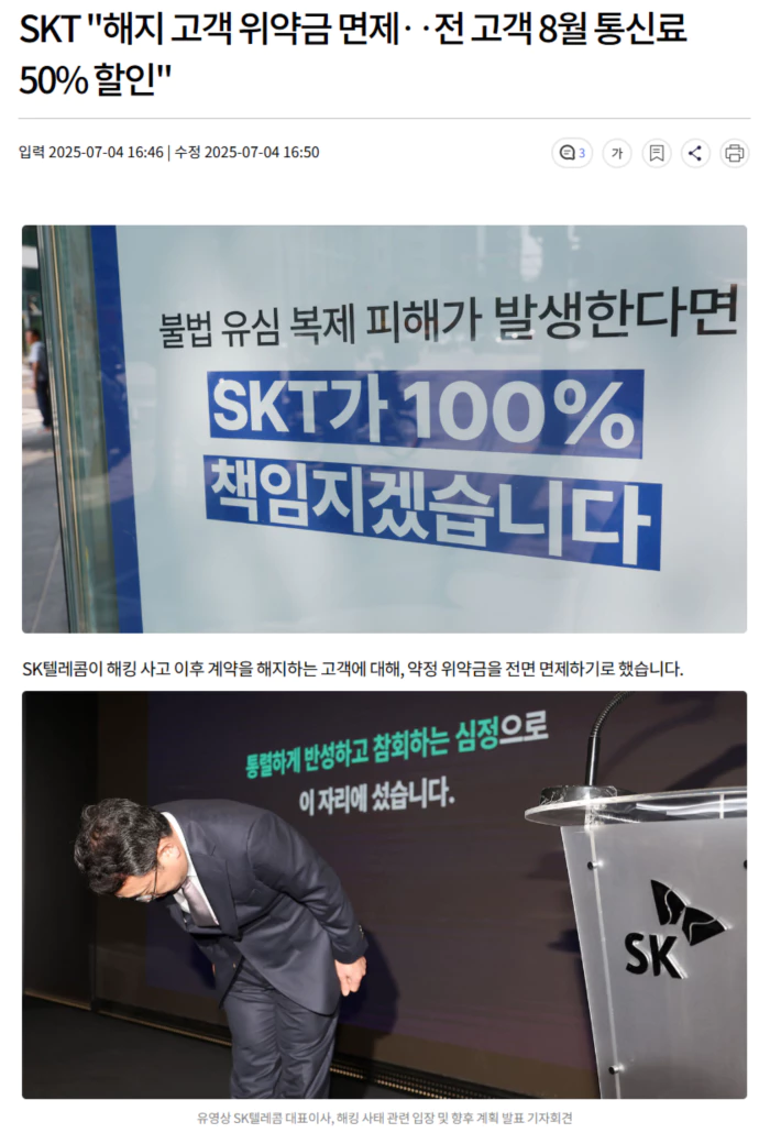 SKT는 민관합동조사단의 해킹사고 조사결과 발표 이후 기자회견을 열고, "해킹 사고 이후 이미 계약을 해지한 고객과 14일까지 해지할 예정인 고객들을 대상으로, 계약 해지에 대한 위약감을 변제한다"고 발표했습니다.