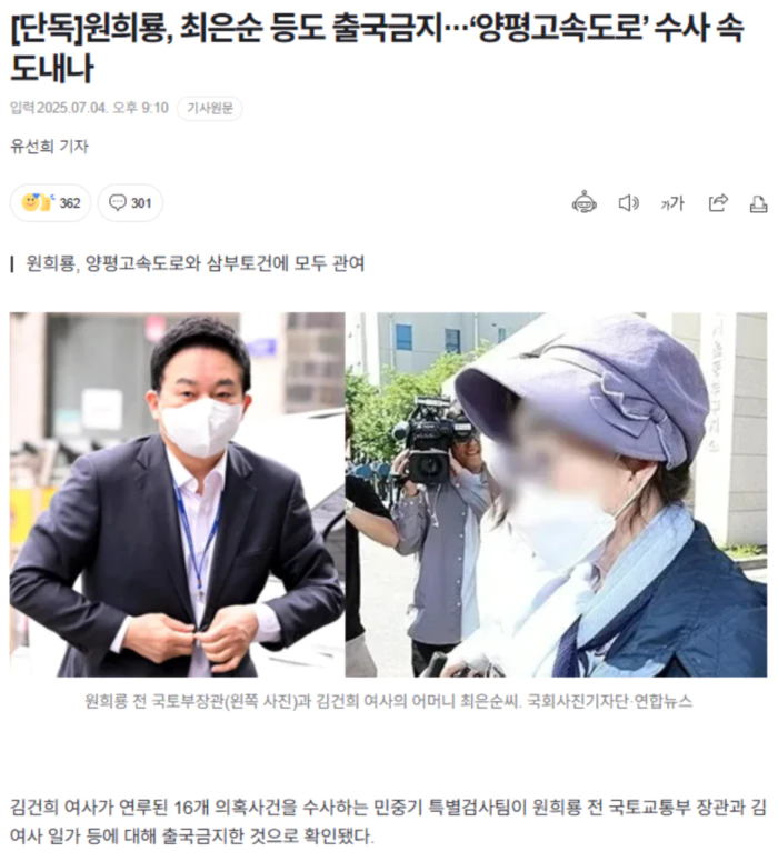 4일 경향신문 취재 결과 특검팀은 특검을 출범하면서 원 전 장관과 김 여사의 어머니인 최은순씨(78), 김 여사의 오빠 김모씨(54) 등에 대해 모두 출국금지 조처를 갱신한 것으로 확인됐다. 수사기관이 바뀌면서 특검팀에서 출국금지 여부를 판단해 이같이 조처했다. 출국금지는 특검팀이 수사의 대상을 명확히 한다는 의미가 있다. 원 전 장관과 최씨 등은 모두 ‘양평고속도로 특혜 의혹’과 관련돼 있다. 이 의혹은 서울-양평고속도로 노선 종점이 기존 경기도 양평군 양서면에서 강상면으로 변경되는 과정에서 불거진 특혜 사건이다. 원 전 장관 재직 시절인 2023년 5월 국토부는 예비타당성 조사까지 통과한 양평 고속도로 노선의 종점 변경안을 발표했다. 강상면에 김 여사 일가가 땅 29필지를 보유하고 있는 사실이 알려지면서 특혜 의혹이 제기됐다. 특검팀이 다루는 다른 사건에 비해 상대적으로 검찰 수사가 되지 않아 우선해 다룰 것이라는 전망이 나온다. 원 전 장관은 삼부토건 주가조작 의혹에도 연루돼 있다. 이 의혹의 핵심은 김 여사 계좌를 관리한 블랙펄인베스트의 전 대표 이종호씨가 해병대 예비역들이 모인 온라인 단체대화방에서 “삼부 체크”라고 언급하고, 이후 주가가 급등한 것이다. .. 후략 ..