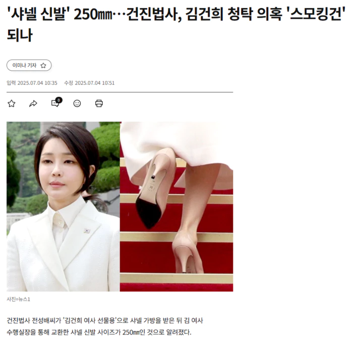 김 여사의 평소 신발 사이즈와 비교해 본다면 해당 신발을 비롯한 샤넬 제품들이 김 여사에게 전달됐을 거라는 정황으로 판단될 수 있다는 분석이다. 지난 3일 CBS노컷뉴스 보도에 따르면 김건희 특검팀(민중기 특별검사)이 최근 남부지검으로부터 전달받은 전씨 관련 수사 기록에 전씨가 교환한 샤넬 신발의 사이즈 정보가 담겼다. 하지만 신발 사이즈가 비슷하다는 사실 만으로 김 여사 유죄를 입증할 결정적인 증거가 되기 어렵다는 반론도 나오는 상황이다. 앞서 김 여사 키가 작아도 160대 후반, 최대 170이라는 추측이 나왔다. 윤석열 전 대통령과 함께 해외 출국하던 당시 모습을 보면 김 여사의 구두 사이즈가 비교적 큰 편임을 알 수 있다. 일반적으로 168cm의 여성은 작으면 240에서 최대 250 사이즈를 신는 것이 보통이다. 하지만 이는 브랜드별로 상이하기 때문에 스모킹건이 될지는 미지수다. 검찰은 김건희 여사 수행비서 유경옥 전 대통령실 행정관이 2022년 4월에 건네받은 샤넬백은 다른 모델의 가방과 신발로, 7월에 받은 샤넬백은 또 다른 가방 2개로 각각 교환한 정황을 확인했다. .. 후략 ..