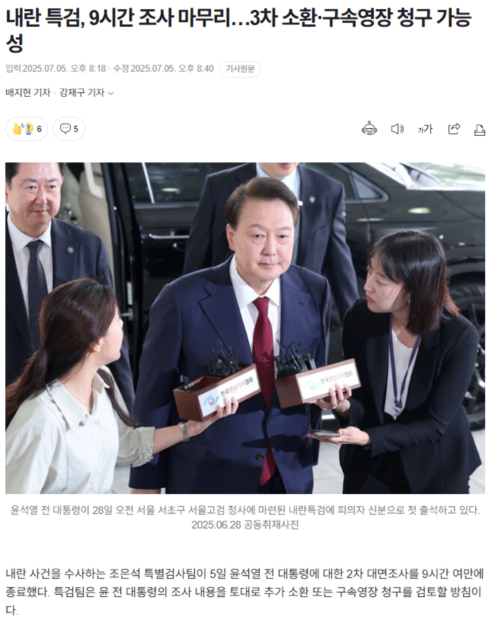 특검팀은 이날 서울 서초구 서울고검에 있는 6층 조사실에서 오전 9시4분부터 조사를 시작해 오후 6시34분 조사를 종료한 뒤 조서 열람을 시작했다고 밝혔다. 조사 9시30분 만에 두 번째 대면조사가 마무리된 셈이다. 특검팀은 오전엔 윤 전 대통령을 상대로 체포방해 혐의를, 오후 조사에선 계엄 전후 국무회의 상황과 외환 혐의를 조사한 것으로 전해졌다. 애초 야간 조사가 예상됐지만 특검팀 쪽은 이날 준비한 조사 내용을 모두 확인했다는 입장이다. 특검팀은 윤 전 대통령에게 국무위원을 상대로 한 직권남용 혐의를 집중적으로 따져 물은 것으로 알려졌다. 윤 전 대통령이 지난해 12월3일 비상계엄 사전 국무회의에서 정족수만 채우기 위해 일부 국무위원들은 부르지 않으면서 이들의 국무회의 심의·의결권을 침해했다는 게 특검팀의 시각이다. 특검팀은 최근 이주호 사회부총리 겸 교육부 장관과 유상임 과학기술정보통신부 장관, 안덕근 산업통상자원부 장관 등 사전 국무회의에 참석하지 않은 국무위원을 참고인 신분으로 불러 조사했다. 특검팀은 이들을 윤 전 대통령의 직권남용 행위의 ‘피해자’로 보고 있다. 특검팀은 윤 전 대통령이 ‘사후 비상계엄 선포문’ 작성·폐기를 지시한 혐의도 조사했다. 강의구 전 대통령실 부속실장은 계엄 선포 직후인 지난해 12월5일 김주현 전 대통령실 민정수석으로부터 ‘대통령의 국법상 행위는 문서로 해야 하는데 문서가 있냐’는 말을 듣고, 사후 계엄 선포문을 작성해 한덕수 전 국무총리와 김용현 전 국방부 장관의 서명을 받았으나 한 전 총리의 요청으로 폐기했다. 강 전 부속실장은 윤 전 대통령에게 작성 당시 결재를 받았고, 폐기 과정에서도 보고 및 승인을 받았다. 다만 윤 전 대통령은 조사 과정에서 “국방부 장관이 준비한 선포문 관련 행정처리 문건”이라는 취지로 반박한 것으로 알려졌다. 윤 전 대통령은 이날 외환 혐의 관련 조사도 함께 받았다. 특검팀은 최근 ‘평양 무인기 침투는 윤 전 대통령의 지시라고 들었다’는 군 현역 장교의 녹음파일을 확보했다. 녹음파일에는 “브이(V) 지시다. 국방부·합참 모르게 해야 한다”, “브이아이피(VIP)랑 장관이 북한 발표하고 박수치며 좋아했다” 등의 내용이 담겼다. 이밖에도 특검팀은 드론작전사가 지난해 6월부터 무인기 침투 작전 관련 계획을 용산 대통령실에 보고한 정황을 확보하고, 지난해 10∼11월 평양 무인기 침투 작전이 최소 다섯 차례 진행됐다는 군 관계자의 증언도 확보한 것으로 알려졌다. .. 후략 ..