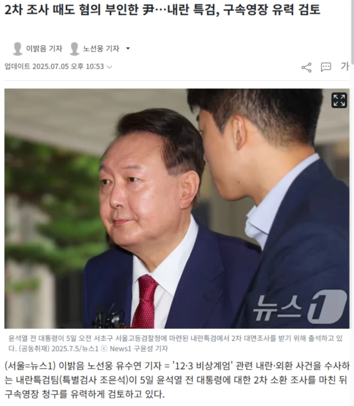 윤 전 대통령은 내란특검의 1·2차 소환 조사에서 혐의 대부분을 부인한 것으로 전해졌다. 5일 뉴스1 취재를 종합하면 내란특검팀은 윤 전 대통령의 구속영장 청구 방안을 검토하고 있다. 일각에서는 이날 윤 전 대통령과 관련한 조사가 사실상 마무리돼 3차 소환 조사 없이 구속영장을 곧바로 청구할 것이라는 전망도 나온다. 특검팀은 이날 오전 9시부터 오후 6시 34분까지 약 9시간 30분 동안 윤 전 대통령을 조사했다. 조사를 마친 윤 전 대통령은 오후 10시 30분 현재 조서를 열람하고 있다. 윤 전 대통령은 지난 1차 소환 조사(6월 28일)에 이어 5일 2차 조사에서도 혐의 대부분을 부인한 것으로 알려졌다. 윤 전 대통령은 △경찰·고위공직자범죄수사처(공수처)의 체포영장 집행을 저지한 혐의(특수공무집행 방해) △비화폰 통화기록 삭제를 지시한 혐의(경호처법상 직권남용 교사) △12·3 비상계엄 당시 국무회의와 관련해 국무위원 대상 직권남용 혐의 △사후 계엄선포문 작성 관여 혐의(허위공문서 작성) △북풍 공작 혐의(일반 이적 또는 외환 유치 혐의)를 받고 있다. 특검팀은 5일 조사에서 윤 전 대통령의 혐의 대부분을 조사했다. 오전에는 특수공무집행 방해와 관련한 조사를 끝냈고, 오후에는 경호처법상 직권남용 교사·직권남용·외환 등 나머지 혐의와 관련한 조사를 상당 부분 진행했다. 내란특검팀은 △윤 전 대통령이 사후 계엄 선포문 폐기를 승인했다는 혐의 △비화폰 기록 삭제를 지시했다는 혐의 △체포영장 집행을 저지한 혐의 등이 구속 요건에 해당하는지 살피는 것으로 알려졌다. 법원은 형사소송법 제70조에 따라 증거인멸과 도주 우려가 있을 때 피의자의 구속영장을 발부한다. .. 후략 ..