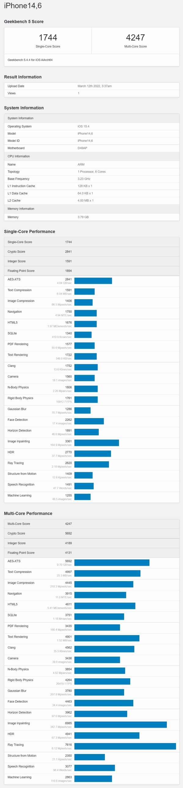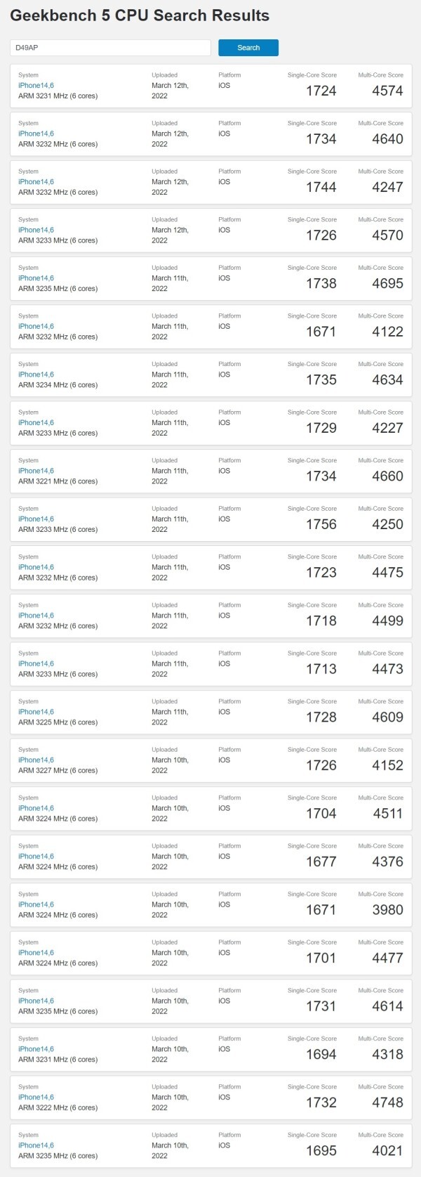 아이폰 SE(3세대)의 A15 빅코어 클럭이 기존 아이폰 13 라인업의 A15와 동일한 3.2Ghz로 아이패드 미니 6세대에 탑재된 A15 칩셋 처럼 2.9GHz로 다운클럭되지 않은 것으로 긱벤치에서 확인되었습니다. (미니 6세대 A15는 5코어 GPU 구성)