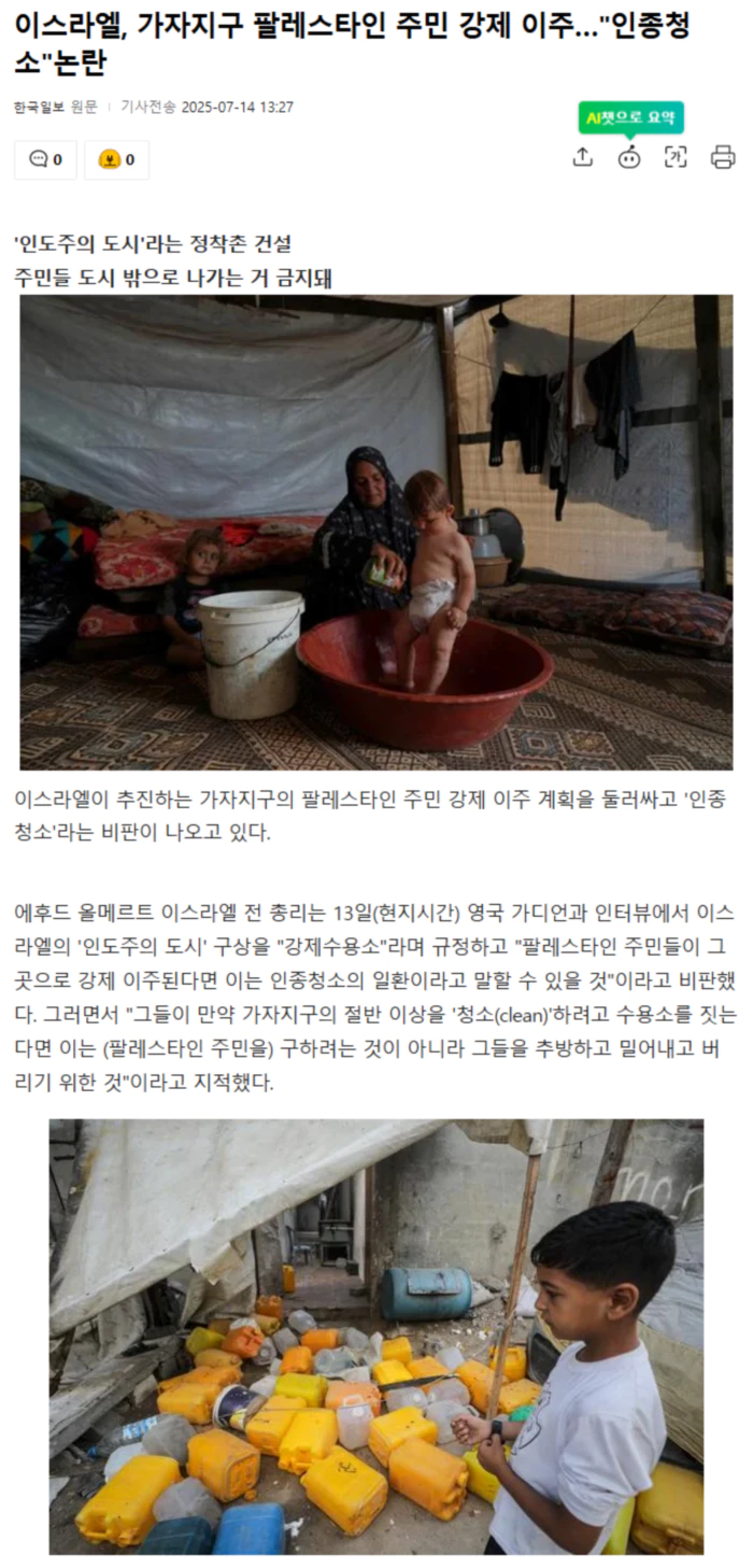 앞서 이스라엘 카츠 이스라엘 국방장관은 지난 7일 가자지구 남쪽의 중심도시 라파에 '인도주의 도시'라는 정착촌 건설을 군에 지시했다.