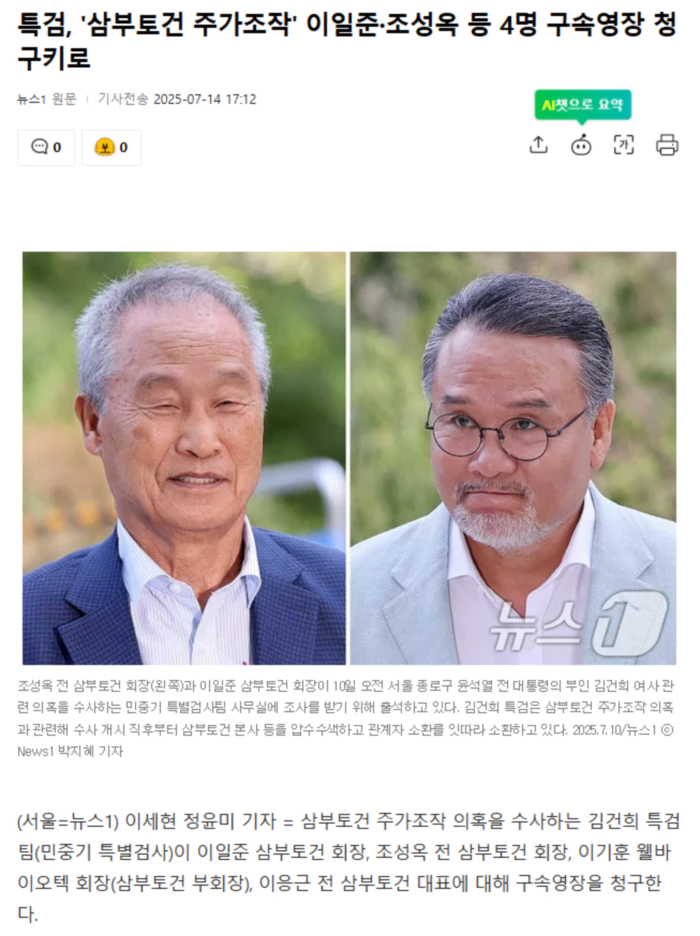 앞서 특검팀은 지난 9일 삼부토건 정창래 전 대표와 오일록 현 대표를, 지난 10일 이 회장과 조 전 회장을 피의자 신분으로 불러 조사했다.