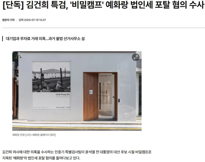 특검이 예화랑의 지난 10년간(2015~2024년) 법인계좌 내역 등을 살피기 위해 압수수색 영장을 신청해 강제 수사에 나설 가능성이 제기된다.