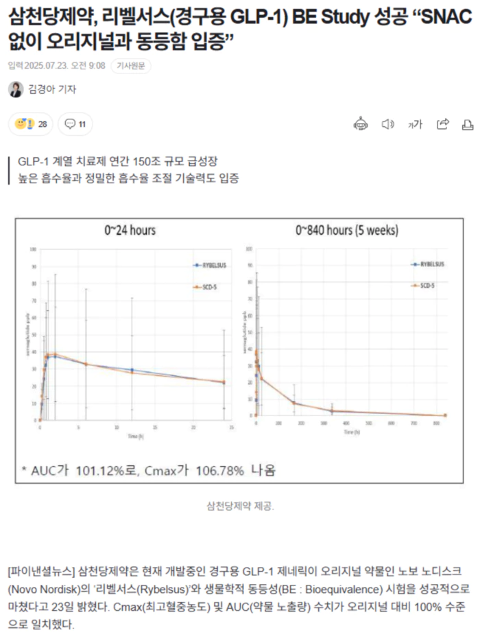 (출처: 삼천당제약, 리벨서스(경구용 GLP-1) BE Study 성공 “SNAC 없이 오리지널과 동등함 입증”)