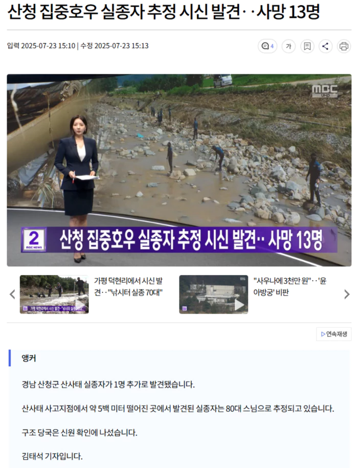 만약 실종된 스님으로 확인되면 산청군 집중호우 사망자는 13명으로 늘어나고, 남은 실종자는 산청군 신등면 율현리에서 급류에 휩쓸린 80대 남성 1명만 남게 됩니다.