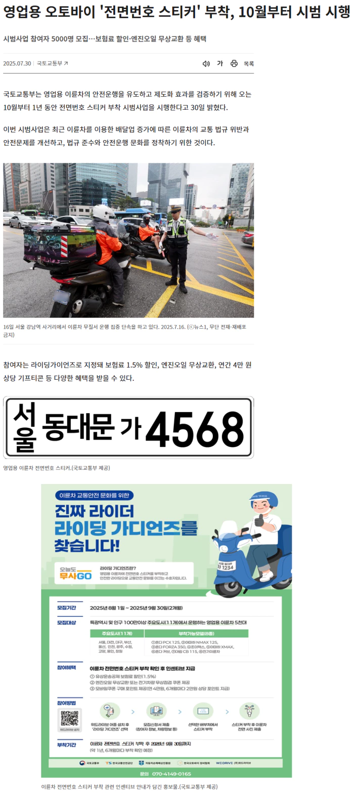 전면번호 스티커는 운행 중 식별이 쉬운 디자인으로 다양한 형태 중 선택할 수 있으며, 한국교통안전공단 지역본부와 한국오토바이정비협회 지정 정비센터에서 배포·부착할 예정이다.