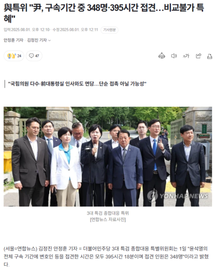 특위는 이날 국회 기자회견에서 이같이 공개하고 "395시간은 일수로 치면 16일이 넘는다. 비교할 수 없는 특혜"라고 언급했다. 특위는 "1차 구속기간(1월 16일∼3월 6일) 동안 윤석열은 292명을 접견했고 접견 횟수는 151회이며 시간은 모두 341시간 25분"이라며 "2차 구속기간(7월 10∼29일)엔 56명 접견, 접견 횟수는 40회, 접견 시간은 모두 53시간 53분"이라고 말했다. 이어 "명단엔 국민의힘 윤상현, 권영세, 김민전, 이철규, 김기현 의원 등이 포함돼 있다"며 "그밖에 윤석열 1차 구속 당시 비서실장이었던 정진석, 당시 대통령비서실 제1부속실장이었던 강의구도 접견 명단에 포함돼 있음을 확인했다"고 했다. 그러면서 "국회의원 및 당시 비서실장 및 제1부속실장과의 접견은 단순한 면담이 아니라 법적 사안과 관련된 민감한 사적 접촉일 가능성을 배제할 수 없다"고 주장했다. 특위는 "(윤석열 전 대통령이) 구치소 내에서 특정 정치세력과 수차례 접촉하고, 장시간의 접견을 통해 편안한 수용 생활을 누리는 등 각종 특혜가 있었음을 확인했다"며 "서울구치소장은 당장 특검의 윤석열에 대한 강제 인치 지휘에 협조하라"고 촉구했다. .. 후략 ..