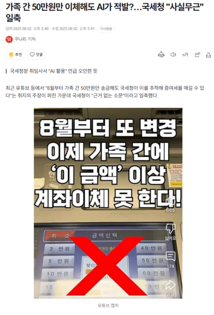 2일 기준 유튜브에는 '8월부터 이 금액 이상 가족 간 계좌이체 못합니다' '8월부터 국세청 인공지능(AI)이 돈 흐름 추적'과 같은 제목의 동영상이 여러 건 올라왔다. 일부 영상은 조회 수 200만 회를 넘기도 했다. 이 동영상들은 국세청이 8월 1일부터 AI가 개인 계좌의 모든 거래 내용을 자동으로 분석해 세금을 징수하며 가족 간에도 50만원 이상을 주고받으면 증여세가 부과된다는 주장 등을 담았다. 일부 경제 관련 인플루언서나 세무사 역시 유사한 주장을 사실처럼 설명하면서 '세금 폭탄을 피하는 방법' 등의 내용으로 공유하고 있다. 월 100만원씩 10년간 생활비를 이체하면 최소 1000만원 이상의 증여세가 부과된다는 주장을 제기하는 인플루언서도 있다. 하지만 이는 국세청이 발표한 내용과는 다르다. 앞서 국세청은 개인의 소액 거래를 들여다보기 위해 8월부터 새롭게 가동하는 시스템은 없다고 밝혔다. 국세청 관계자는 "조세 포탈 혐의 포착 등을 위한 자체 전산 시스템을 운영하고 있지만, 기존과 달리 무작위 개인 계좌 전체를 조사하는 일은 없다"며 "소액 거래를 들여다보기 위한 새로운 시스템은 운영하지 않고 있다"고 일축했다. 전문가들 역시 상식선에서 이뤄지는 가족·지인 간 계좌이체를 들여다볼 필요가 없다며 현실성이 떨어지는 소문이라고 평가했다. 유튜브 등에 이같은 주장이 확산한 배경에는 최근 임광현 신임 국세청장이 취임사 등을 통해 AI 탈세 적발 시스템을 언급한 점이 작용한 것으로 보인다. 임 청장은 지난 15일 국회 인사청문회 모두 발언에서 "AI를 활용한 탈세 적발 시스템을 고도화하겠다"라고 밝혔는데, 이는 국세청의 기존 업무인 세금 부과와 징수, 탈루 혐의 조사 등에 AI를 활용해 기존 탈세 조사를 강화하겠다는 의미로 소액 개인 거래 추적과는 관련이 없다. .. 후략 ..