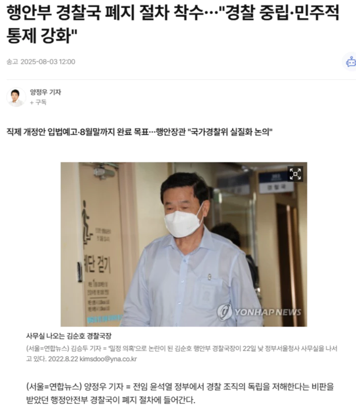 행안부는 대통령 공약의 이행 일환으로 경찰국 폐지를 위한 직제 및 직제 시행규칙 개정 절차에 착수했다고 3일 밝혔다. 이는 국정기획위원회가 경찰국 폐지를 신속 과제로 선정한 데 따른 후속 조치다. 이에 따라 행안부는 대통령령인 '행정안전부와 그 소속기관 직제'와 행안부 부령인 '행정안전부와 그 소속기관 직제 시행규칙' 개정안을 마련했다. 이달 4∼11일 입법예고 및 관계기관 의견조회, 차관 및 국무회의 등의 절차를 거쳐 8월 말까지 개정 완료할 예정이다. 입법예고는 관보와 '국민참여입법센터(http://opinion.lawmaking.go.kr)'에서 확인할 수 있다. 개정안에 대한 의견은 일반 또는 전자우편, 팩스, 국민참여입법센터를 통해 제출할 수 있다. 윤호중 행안부 장관은 "경찰국 폐지는 경찰의 중립성 및 민주적 통제 강화를 위해 신속히 추진해야 하는 과제"라며 "국정기획위원회에서 진행 중인 국가경찰위원회 실질화 방안 논의에도 적극 협조하겠다"고 밝혔다. .. 후략 ..