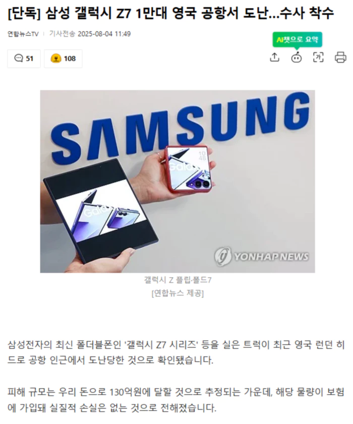 연합뉴스TV의 취재를 종합하면 최근 런던 히드로국제공항 인근에서 갤럭시 Z플립7과 Z폴드7 등 1만2천여 대가 도난당했습니다. 제품은 공항 도착 이후 창고로 옮겨진 뒤 도난 피해가 발생한 것으로 전해졌습니다. 도난당한 물품은 Z폴드7·Z플립7 약 5천여 대를 비롯해 갤럭시워치8 5천여 대 등 신제품 위주로 확인됐습니다. 갤럭시 S25와 A16 등 기존 출시 모델도 일부 포함된 것으로 알려졌습니다. 삼성전자 Z폴드7와 Z플립7은 유럽 기준으로 각각 1,799유로, 1,149유로로, 우리돈 각각 288만원, 184만원에 판매될 예정이었습니다. 이를 감안할 때 전체 피해액은 최소 900만유로로, 우리돈 약 133억원에 이를 것으로 업계는 추산하고 있습니다. 다만 해당 물량이 보험에 가입돼 실질적 손실은 없는 것으로 전해졌습니다. 사건 직후 영국 경찰은 수사에 착수했으며 도난당했던 컨테이너는 발견된 것으로 알려졌습니다. .. 후략 ..