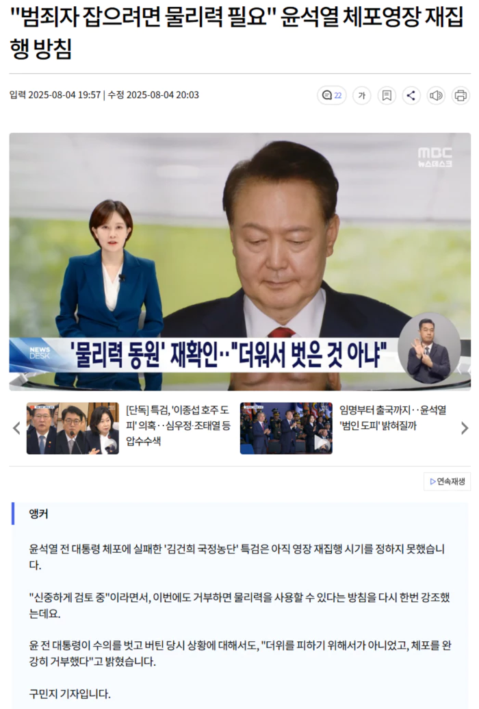 문홍주 특검보는 "물리력을 포함하지 않고 어떻게 범죄자를 잡겠느냐"며 체포영장 집행에는 기본적으로 물리력이 포함돼 있다"고 했습니다.