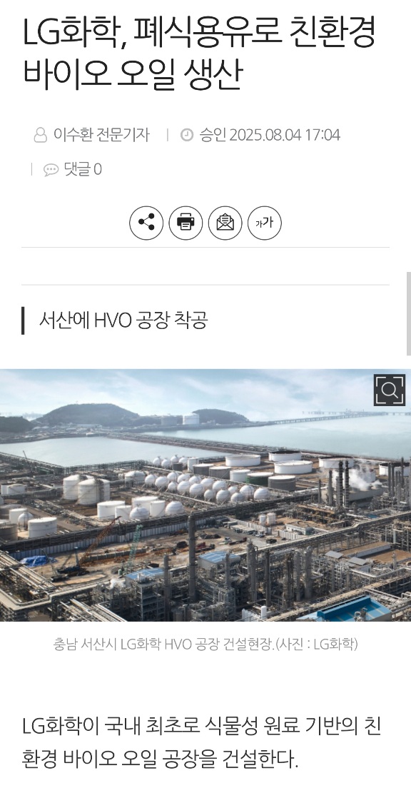 LG화학 자회사 엘지에니바이오리파이닝은 충남 서산시에서 HVO(Hydrotreated Vegetable Oil) 공장 착공식을 진행했다고 4일 밝혔다. 오는 2027년까지 연간 30만톤(t) 생산 규모로 건설된다.