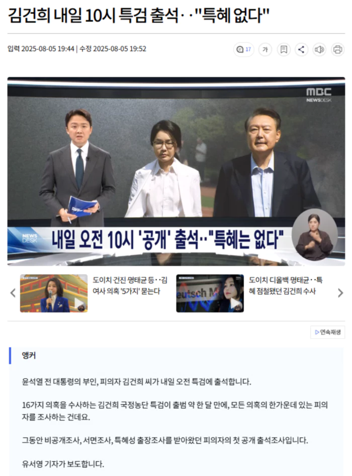(출처: 김건희 내일 10시 특검 출석‥"특혜 없다")
