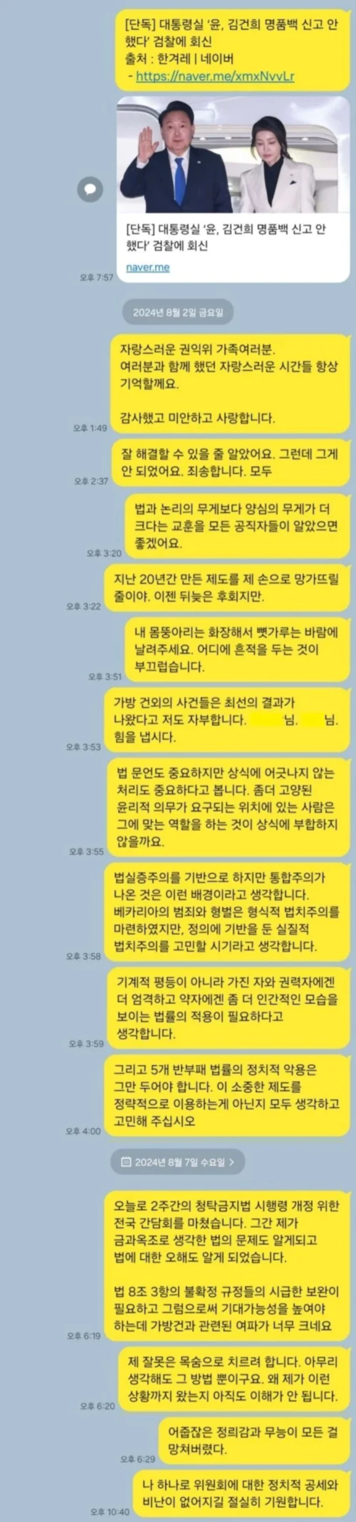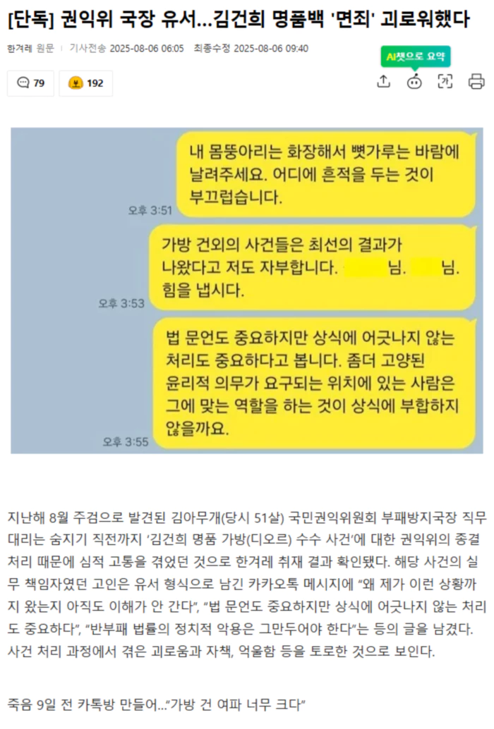5일 한겨레가 유족을 통해 확보한 김 전 국장의 카카오톡 메시지를 보면, 그는 숨진 채 발견되기 9일 전인 지난해 7월30일부터 8월7일까지 해당 앱의 ‘나와의 채팅’ 기능을 활용해 ‘김○○ 남기는 글입니다’라는 제목의 대화방을 만들어 모두 26개의 글을 작성했다. 이 가운데 7개는 가족과 동료들에게 고마움과 미안함 등을 전하는 내용이었고, 나머지 19개에는 권익위의 명품 가방 수수 사건 종결 처리와 부패 방지 제도 등에 대한 자신의 생각, 아쉬움, 억울함, 당부 등을 적어놓았다. 김 전 국장은 이 메시지들을 실제로 발송하지는 않았다. 김 전 국장이 대화방을 만든 것은 권익위 전원위원회가 김 여사 명품 가방 수수 사건에 대해 ‘법률 위반 사항이 없다’며 종결 처리한 지 50일이 지난 2024년 7월30일이다. 그는 같은 날 ‘윤석열 대통령이 김건희씨의 명품 가방 수수 사실을 감독기관 등에 신고하지 않았다’고 보도한 한겨레 단독 기사 링크를 첫 메시지로 올렸다. 이어 사흘 뒤인 8월2일 김 전 국장은 대화방에 아내와 자식, 동료 등에게 남기는 작별 인사를 올린 뒤 명품 가방 수수 사건과 관련된 것으로 보이는 메시지를 집중해서 올린다. “가방 건 외의 사건들은 최선의 결과가 나왔다고 저도 자부합니다”라는 메시지를 시작으로 “5개 반부패 법률의 정치적 악용은 그만두어야 합니다. 이 소중한 제도를 정략적으로 이용하는 게 아닌지 모두 생각하고 고민해주십시오”, “기계적 평등이 아니라 가진 자와 권력자에겐 더 엄격하고 약자에겐 좀 더 인간적인 모습을 보이는 법률의 적용이 필요하다고 생각합니다”라는 메시지였다. 김 전 국장은 숨지기 하루 전인 8월7일 마지막으로 메시지 6개를 올렸다. 그는 “가방 건과 관련된 여파가 너무 크네요. 제 잘못은 목숨으로 치르려 합니다. 아무리 생각해도 그 방법뿐이고요. 왜 제가 이런 상황까지 왔는지 아직도 이해가 안 됩니다”라고 적었다. 이어 “어쭙잖은 정의감과 무능이 모든 걸 망쳐버렸다. 나 하나로 위원회에 대한 정치적 공세와 비난이 없어지길 절실히 기원합니다”라고 썼다. 김 국장은 이 메시지를 작성한 다음날 오전, 집에서 주검으로 발견됐다. .. 후략 ..
