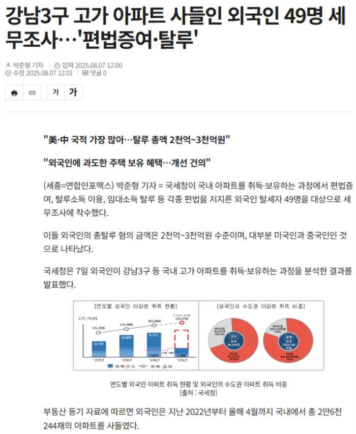 주로 수도권 아파트에 집중돼 있으며, 서울 취득 중 강남3구와 마포·용산·성동구(마용성) 비중은 39.7%로 나타났다. 국세청은 "수도권 주택시장이 과열되면서 강력한 대출 규제가 시행 중이지만, 자국에서 자금 조달이 가능한 외국인에게는 국내의 각종 대출 규제가 실질적으로 적용되지 않는다"며 "부동산 정책에 부정적인 영향을 미칠 우려가 있다"고 세무조사 실시 배경을 설명했다. 실제로 6.27 대출규제 시행 전후 서울 지역의 아파트 등 주택 취득 건수를 비교한 결과, 내국인은 27.2% 줄어들 동안 외국인은 14.3% 증가했다. 이번 국세청 분석 결과, 각종 편법으로 세금을 회피해 고가 아파트를 거래한 외국인 49명이 확인됐다. 이들은 편법 증여(16명), 탈루소득(20명) 등을 이용해 아파트를 취득했으며, 임대소득을 탈루(13명)하기도 했다. 민주원 국세청 조사국장은 "49명은 12개 국적인데, 미국과 중국의 비중이 3분의 2 이상"이라며 "탈루 혐의 총액은 2천~3천억원 사이 정도"라고 설명했다. 이어 "순수 외국인과 한국계 외국인의 비중은 6대4 정도며, 이들은 총 230여채의 아파트를 보유하고 있었다"고 부연했다. 편법 증여의 경우, 외국인은 부동산 취득 과정에서 외국인등록번호와 여권 번호를 혼용할 수 있어 과세 감시망을 피하기 용이하고, 과세관청이 해외계좌에 접근하기 어렵다는 점을 악용했다. 조사 대상 중에는 자금 출처를 숨기기 위해 자금조달 계획서 등 의무제출 서류를 허위로 기재하거나, 부동산 보유 시 발생하는 세금을 부모가 전액 납부하도록 하는 사례도 있었다. 외국인 신분을 이용해 탈루한 소득을 취득 자금을 마련한 외국인도 발각됐다. 이들은 국내에서 탈루한 소득을 해외 소재 페이퍼컴퍼니와 계좌에 은닉하고, 이를 정상적인 해외 자금 조달로 위장하는 수법으로 감시망을 피했다. 일부는 해외 은닉자금을 다시 국내로 반입하는 과정에서 가상자산이나 불법 환치기를 이용하기도 했다. 국내 병원에서 외국인 환자를 유치하는 업체를 운영하며 수십억원 규모의 수수료 수입을 제대로 신고하지 않거나, 기업 운전자금 명목으로 받은 법인 명의 대출금 등을 아파트 취득자금으로 사용한 사례도 적발됐다. 주택 임대업을 등록하지 않고, 임대소득을 누락한 경우도 다수 포착됐다. 외국계 법인의 국내 주재원 등을 대상으로 강남, 한남동 등 고가 아파트를 임대해 고액의 수익을 벌었지만, 임차인이 전입신고를 하지 않거나 외국인에 대한 소득·계좌 정보가 불명확하다는 점을 악용해 임대소득을 제대로 신고하지 않았다. 특히, 다주택자의 양도세, 취득세 중과 등을 회피하기 위해 허위 양도 계약을 체결해 1주택자로 위장하거나 비거주 외국인임에도 국내 거주자에게만 적용되는 세액 감면을 받은 사례도 있었다. 국세청은 향후 외국인의 국내 아파트 취득·보유·양도 등 거래 전 과정에 대해 철저한 검증에 나설 계획이다. .. 후략 ..