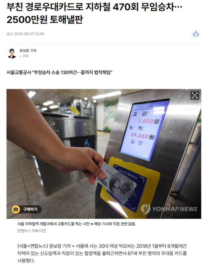 이 기간 약 470회 부정승차를 한 박씨는 폐쇄회로(CC)TV 분석을 하던 역 직원에게 단속돼 1천900만원의 부가운임이 청구됐지만 납부를 거부했다. 결국 서울교통공사는 박씨를 상대로 형사고발과 민사소송을 진행해 법원으로부터 지연이자를 포함한 2천500만원을 지급받을 수 있는 판결을 받아냈다. 서울교통공사는 이처럼 부정승차자를 상대로 끝까지 법적 책임을 물리는 시스템을 가동해 현재까지 130여건의 소송을 진행했다고 7일 밝혔다. 공사는 지난해 부정승차자를 상대로 한 22건의 민사소송을 확정하고 40여건의 강제집행을 했다. 올해도 7월 말 기준 12건의 민사소송을 확정했으며 20건의 강제집행을 진행했다. 박씨 사례는 지금까지 부가운임 소송 최고액이다. 박씨는 1천686만원을 변제했고 내년 말까지 매달 60여만원씩 분납을 약속했다. 공사는 단속부터 징수까지 부정승차 처리의 모든 과정을 체계적으로 관리하는 내부 시스템을 가동 중이다. 또한 부정승차로 단속된 승객이 부가금을 납부하지 않으면 형법 제347조의2 컴퓨터 등 사용사기죄와 형법 제348조의2 편의시설부정이용죄로 형사고발을 하고 있다. 이 경우 통상 벌금형이 부과된다. 공사는 캠페인 실시, 교육청 및 각급 학교 서한문 발송, 역사 내 현수막·배너 설치 등의 노력을 기울이고 있으나 부정승차는 끊이지 않고 있다. 2022∼2024년 3년간 연평균 5만6천여건을 단속해 26억여원을 징수했다. 올해 단속 기록은 7월 말 기준 3만2천325건, 징수액은 15억7천700만원이다. 이에 공사는 과거 대면 단속에서 벗어나 빅데이터 분석 기반의 단속 시스템, 스마트스테이션 CCTV 모니터링 등을 적극 활용 중이다. .. 후략 ..