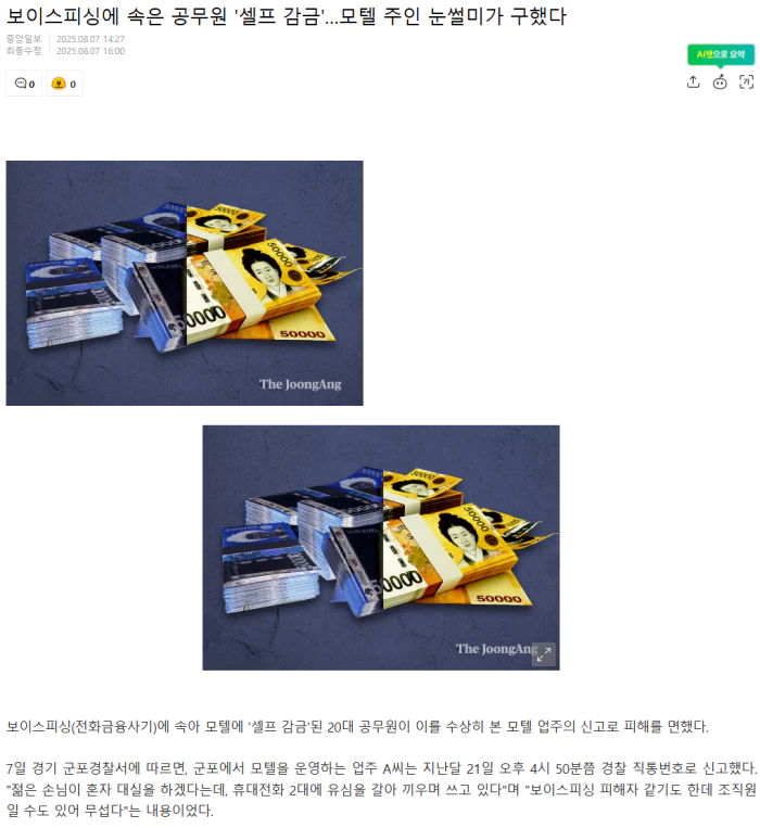 곧장 현장으로 출동한 경찰은 모텔에 있던 20대 B씨를 확인했다. 경찰은 B씨가 보이스피싱 피해자임을 파악하고 계좌 송금 등을 막았다. 공무원인 B씨는 업무 중이던 같은 날 오후 4시쯤 서울중앙지검 검사를 사칭한 보이스피싱 조직원으로부터 "대포통장 사건에 연루됐다"는 연락을 받았다. 이 조직원은 "최대한 빨리 휴대전화를 새로 한 대 구입하고 가장 가까운 모텔에 투숙하고, 재산 증명이 필요하니 모든 계좌 잔고를 전송하라"는 지시를 내렸다. 이에 A씨가 모텔을 찾은 상황이었다. 이는 전형적인 '셀프 감금' 수법이다. 셀프 감금 보이스피싱은 피해자 스스로를 모텔에 감금하게 해 고립시키고, 통화 원격제어 등으로 돈을 갈취하는 신종 범죄다. 통장 잔고뿐 아니라 원격으로 각종 대출을 받게끔 한 뒤 이를 가로채기 때문에 피해가 크다. 또한 고립된 상태라 용의자 추적과 피해금 회수가 쉽지 않다. 당시 B씨의 휴대전화에는 악성 앱이 설치돼 직접 피해 신고가 어려운 상황이었다. 아울러 B씨는 "직장에 불이익이 있을 수 있다"는 조직원의 말에 겁을 먹어 지시를 따른 것으로 알려졌다. A씨는 불안한 표정의 B씨가 복도를 서성이다 유심 교체에 필요한 클립을 빌려달라고 하자 수상함을 느끼고 경찰서 직통번호로 신고한 것으로 파악됐다. 앞서 군포서는 최근 셀프 감금 형태의 보이스피싱이 자주 발생하자 예방을 위해 숙박업소마다 주의 문구가 적힌 팸플릿과 경찰서 직통 번호를 미리 공유했다. .. 후략 ..