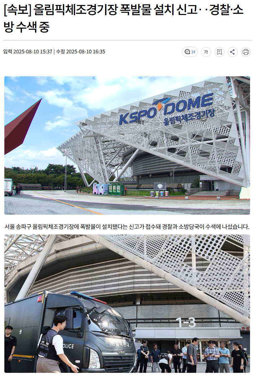 경찰과 소방당국에 따르면, 오늘 낮 2시쯤 "올림픽체조경기장에 폭발물을 설치했다"는 신고가 접수됐습니다.